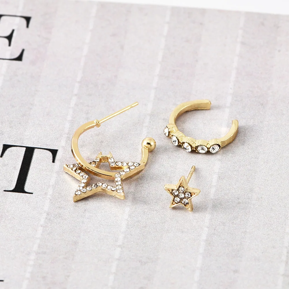 Новинка, модные женские серьги с пятиконечной звездой и кристаллами, комплект с зажимом для ушей, Лидер продаж, дикая бижутерия, оптовая продажа