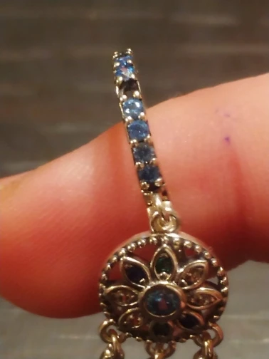 Они крошечные, даже не видно что по кругу расположены камушки, виден только тот, что по центру. Не запаяно колечко, на котором висит подвеска, оно легко раскрывается. Мельчайшие висюльки смешиваются с волосами. Колечки надо запаять и можно носить.
