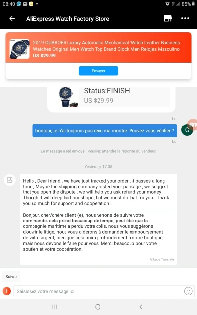 Я никогда не получал свой продукт, я прошу вас отследить его, и вы говорите мне, что нет информации, и вы попросили меня открыть спор, чтобы получить возмещение. Я делаю это, и вы отказываетесь, это показывает, насколько вы нечестны, я действительно разочарован вашими услугами.