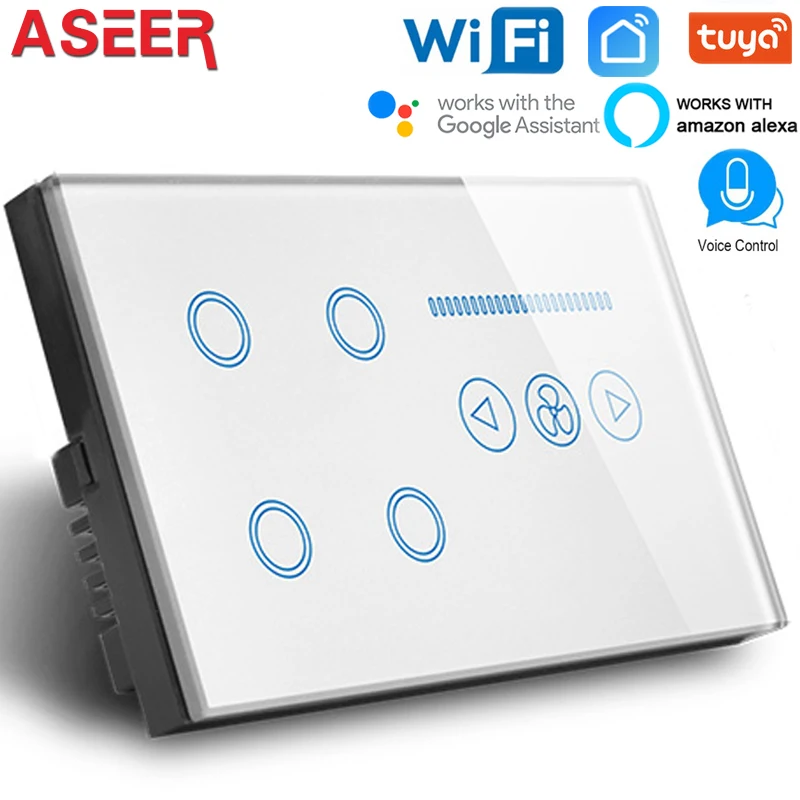 Умный Wi-Fi выключатель ASEER, 4 клавиши, выключатель с Wi-Fi потолочным вентилятором, белаячерная прозрачная стеклянная панель, работает alexa,google