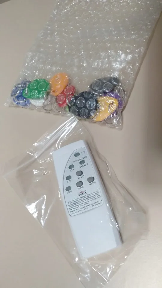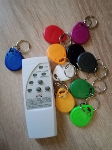 прибор увидел и вроде считал RFID в размере "credit card", 125K. записывать в брелки которые шли в комплекте с прибором не пробовал. не брелок на фото не прочитал ни на одной частоте. а жаль, ради таких и покупал прибор.