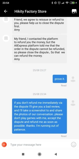 Очень нечестный продавец. Я заказал две стереосистемы из этого магазина. Один прибыл. Другой мне сказали, что мне нужно больше денег. Поэтому я сказал «нет» и сказал им, что не одобряю заказ. Они одобрили заказ. Даже если они не отправили его. Они попросили поставить оценку 5 звезд и сказали мне подтвердить получение, чтобы получить возврат средств. Основной красный флаг. Пришедший стерео может открыть приложение радио. Еще раз они сказали мне дать им оценку 5 звезд и закрыть спор, чтобы получить возмещение. Но у меня было достаточно. Мне нужно показать, насколько неверно. Остерегайтесь этого магазина, очень неверно. Если у вас есть спор, и они сказали вам подтвердить получение. Не верьте им. Подождите, пока AliExpress займется этим.