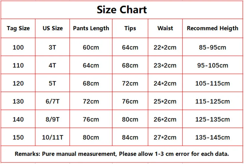 1. Из-за ручного измерения допускается погрешность в 1-3 см;2. Длина брюк и длина талии измеряются сплошной, если вы сомневаетесь, пожалуйста, выпрямите;3. Возраст указан только для справки. Для выбора размера см. «рекомендуемый рост» в таблице размеров. Для детей с лишним весом рекомендуется выбирать размер для новичков.
