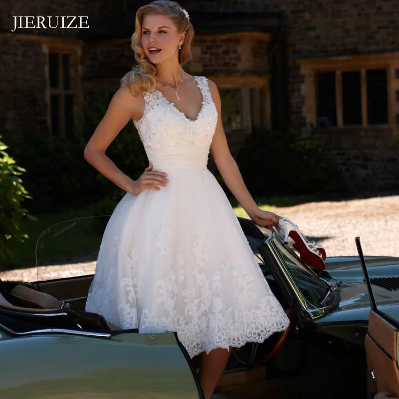 Короткое свадебное платье JIERUIZE, белое, с кружевной аппликацией, с V-образным вырезом и бисером