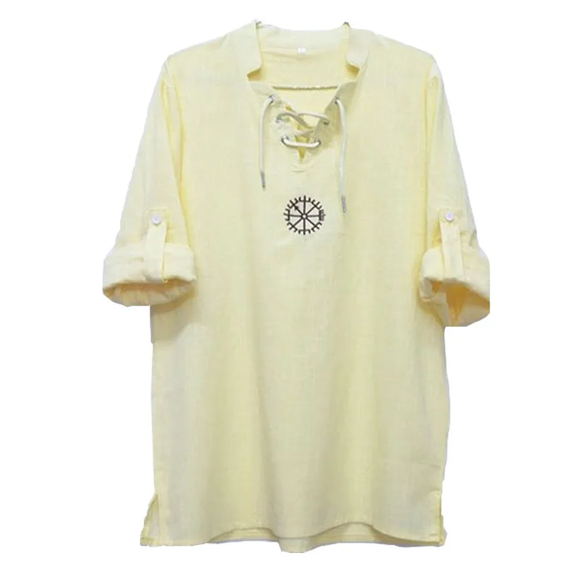 Костюм викингов в средневековом стиле, льняная хлопковая Футболка с вышивкой, с пиратским принтом эпохи Возрождения, с коротким рукавом, на шнуровке, для взрослых