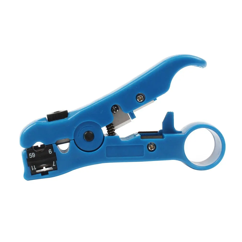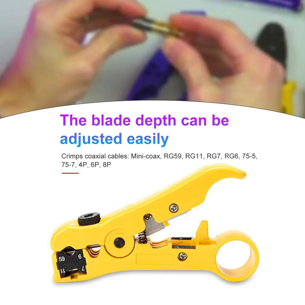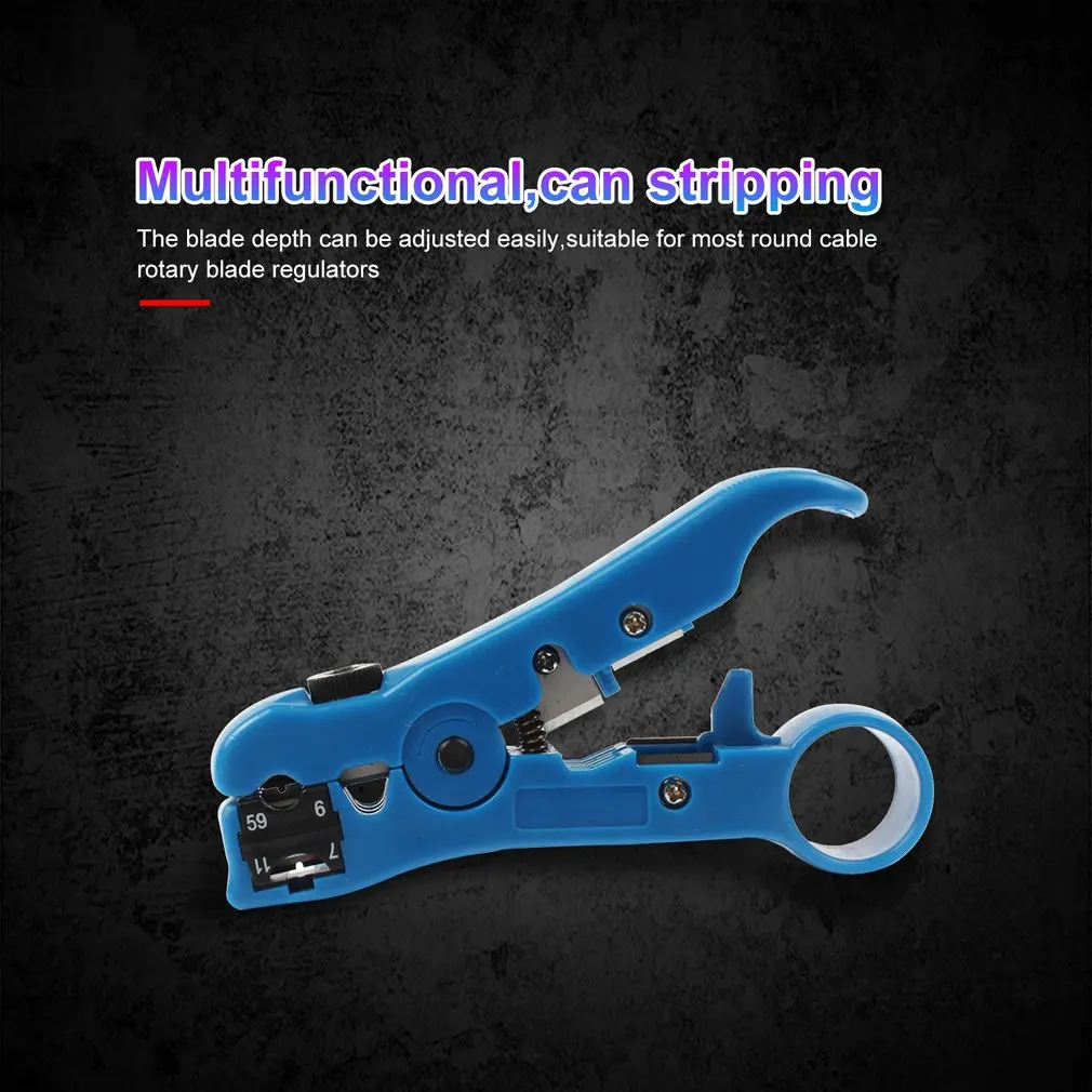 Особенности:1. Многофункциональный, может зачистки и резка кабеля.2. Поворотный разъем сиденья вмещает круглые и плоские кабели.3. Глубину лезвия можно легко отрегулировать, подходит для большинства круглых регуляторов вращающегося лезвия кабеля.4. Встроенная пружина, легко зачистки; ручка с кольцом, легко носить с собой.5. обжимные коаксиальные кабели: Mini-coax, RG59, RG11, RG7, RG6, 75-5, 75-7, 4 P, 6 P, 8 P, UTP, круглый и плоский кабель STP и кабель мультипередачи 3,2-9,0 мм.