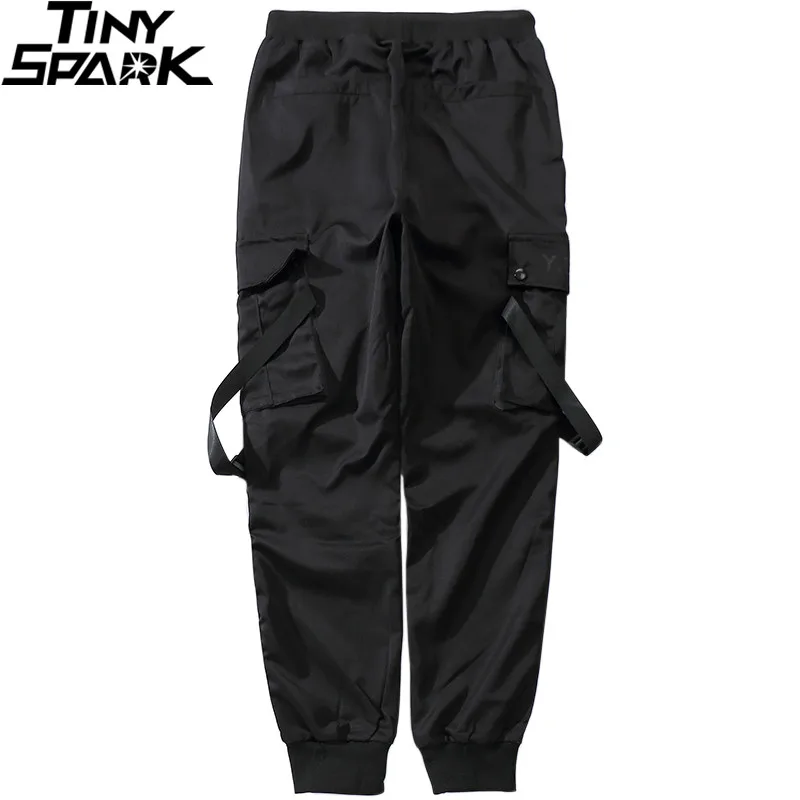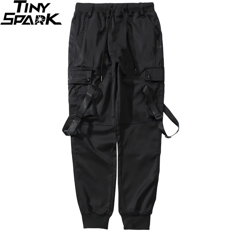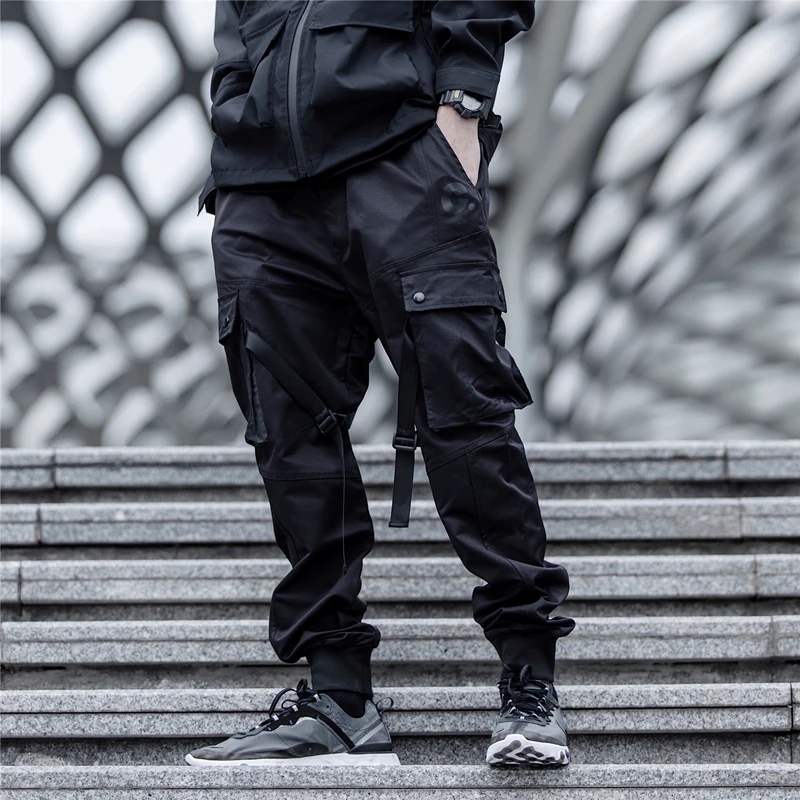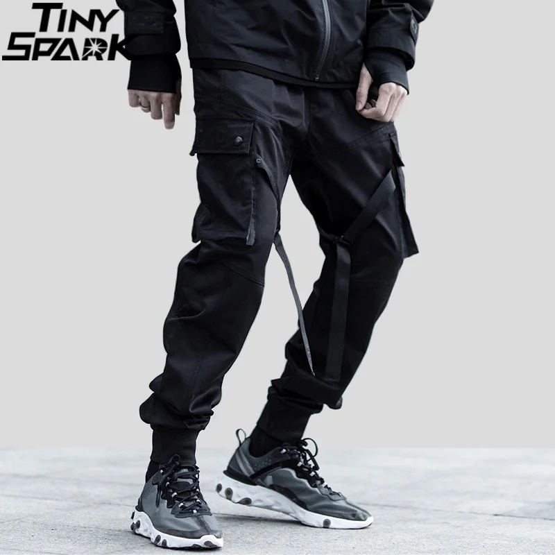 2021 уличная одежда в стиле хип-хоп; Брюки-карго с карманами; Мужские шаровары в стиле Харадзюку; Брюки для бега из ленты; Черные спортивные штаны в стиле хип-хоп