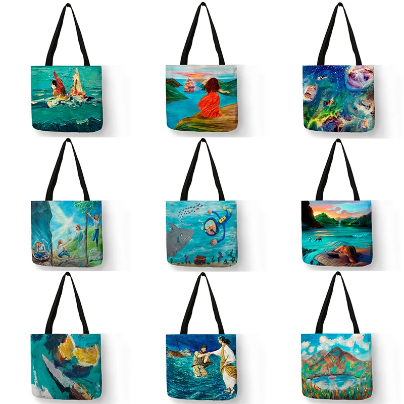 SY0079 Уникальные женские сумки с рисунком масляной живописи на заказ, сумка-тоут, многоразовые сумки для покупок с рисунком пейзажа и фигурок