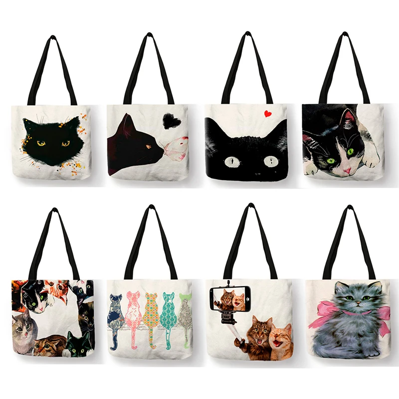 Сумка-тоут женская, из льна, с принтом в виде кошки