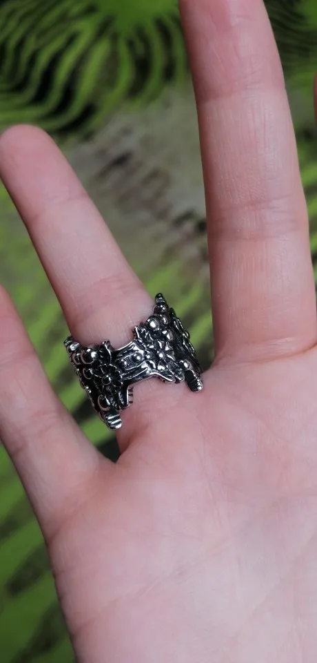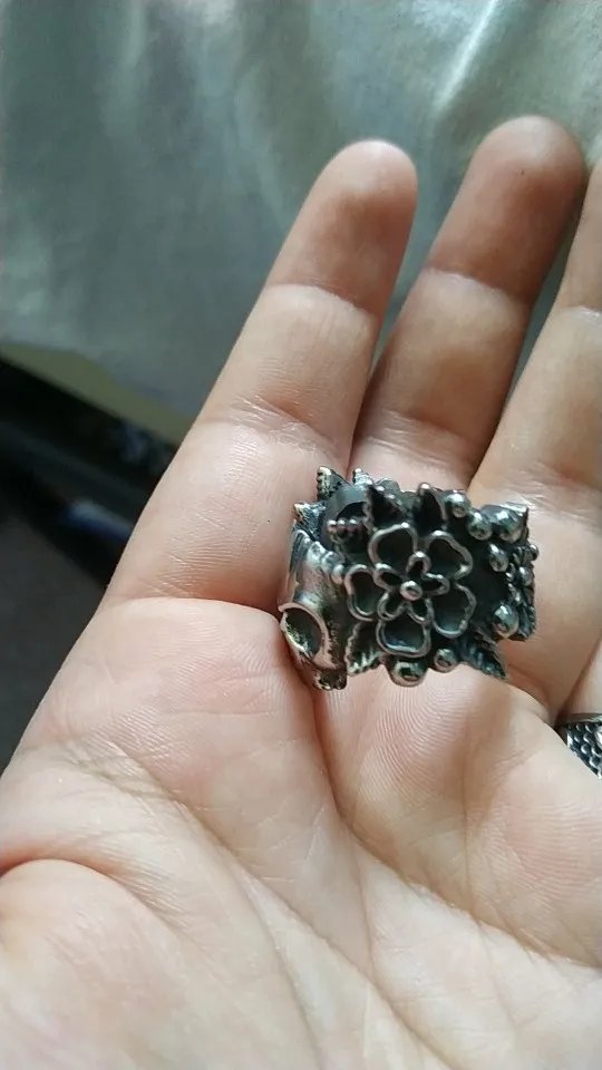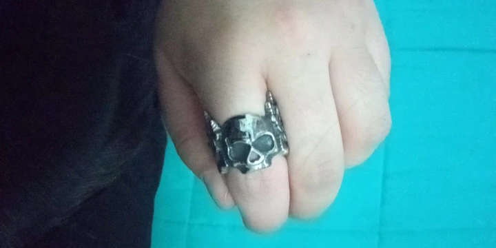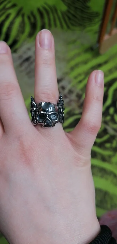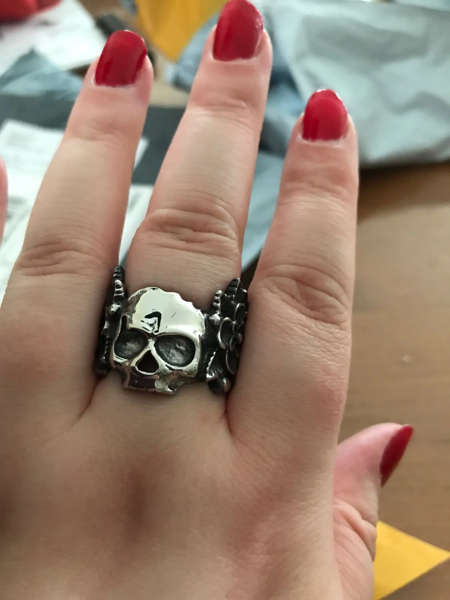 Выглядит не так, как на картинке. Темно-серое/почти черное кольцо без блеска. Цветы не имеют черепа и не торчат над ними. Кольцо выглядит «Мужской» и не выглядит изящно или красиво, как на картинке.