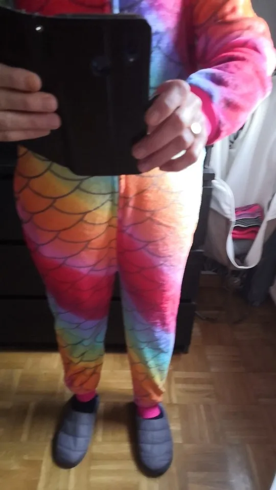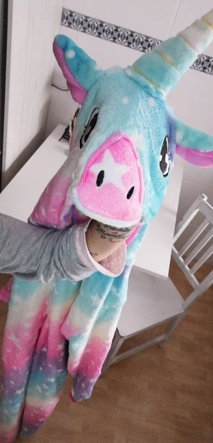 Дочери 10 лет, рост 142см,взяла размер S нормально, хотя вначале показалось большой, но штанины и рукава как раз. Сшит хорошо, ну что еще сказать, кигуруми, как кигуруми.
