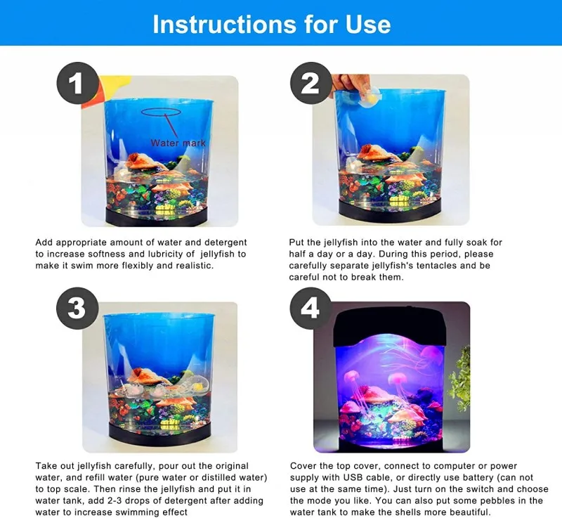 1. Добавьте воду, несколько капель жидкости для мытья посуды и Медузы в резервуар. Осторожно встряхните бак, затем Опустите банк.
