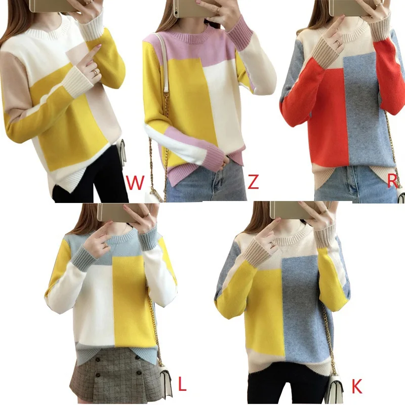 Женский свитер контрастного цвета в Корейском стиле, джемпер с длинными рукавами и пуловер, вязаный свитер, Осень-зима 2019