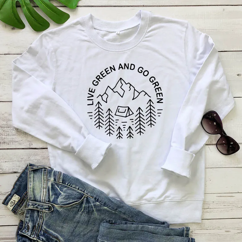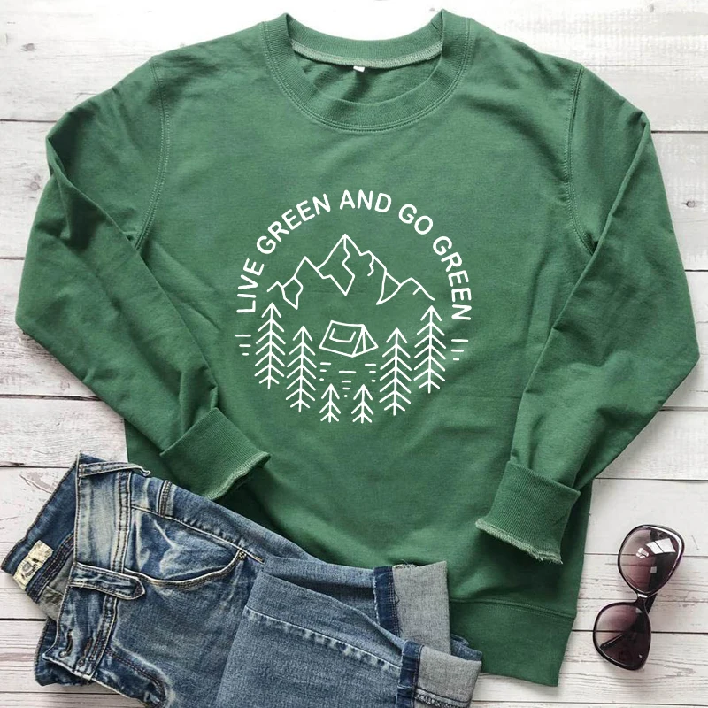 Живая зеленая и зеленая толстовка, повседневный защитный натуральный винтажный джемпер, модная одежда из 100% хлопка, топы с круглым вырезом и горным деревом