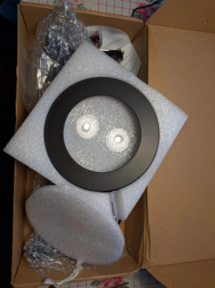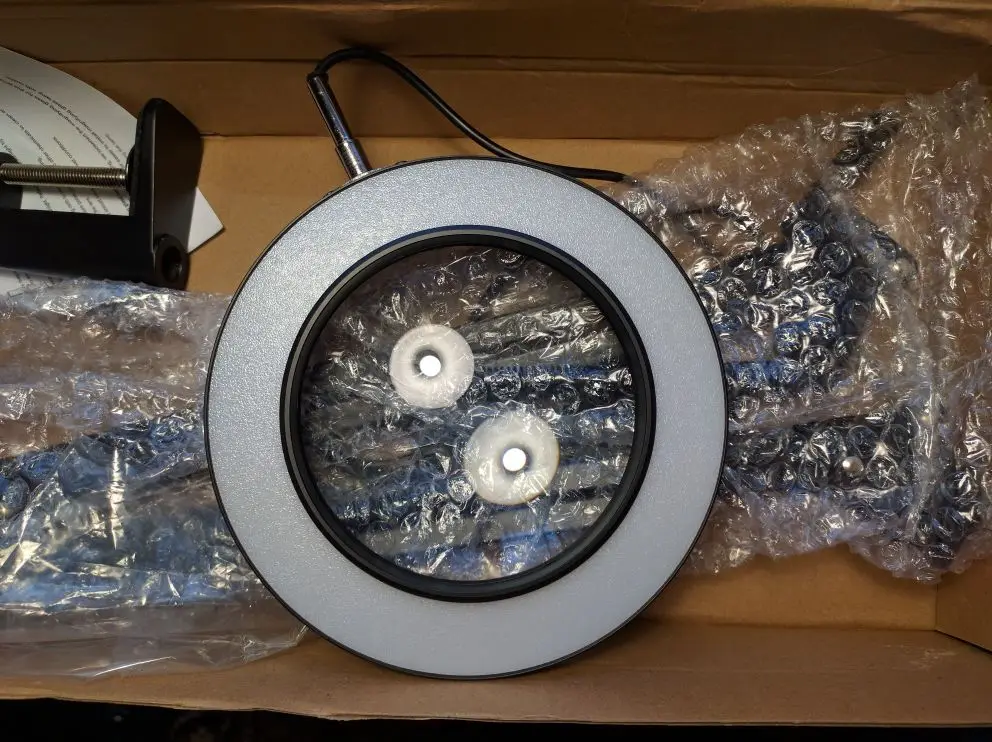 Доставили за три недели. Коробка немного помчалась в дороге, но все целое, ничего не сломалось. Лампа соответствует описанию. На максимальной яркости ток около 1.9 А. Кольцо ощутимо нагревается, яркость при этом на уровне 40-50 Вт лампы накаливания. Собрано добротно. Было бы удобно если бы пульт управления был возле кольца, или встроен в само кольцо. В общем доволен.
