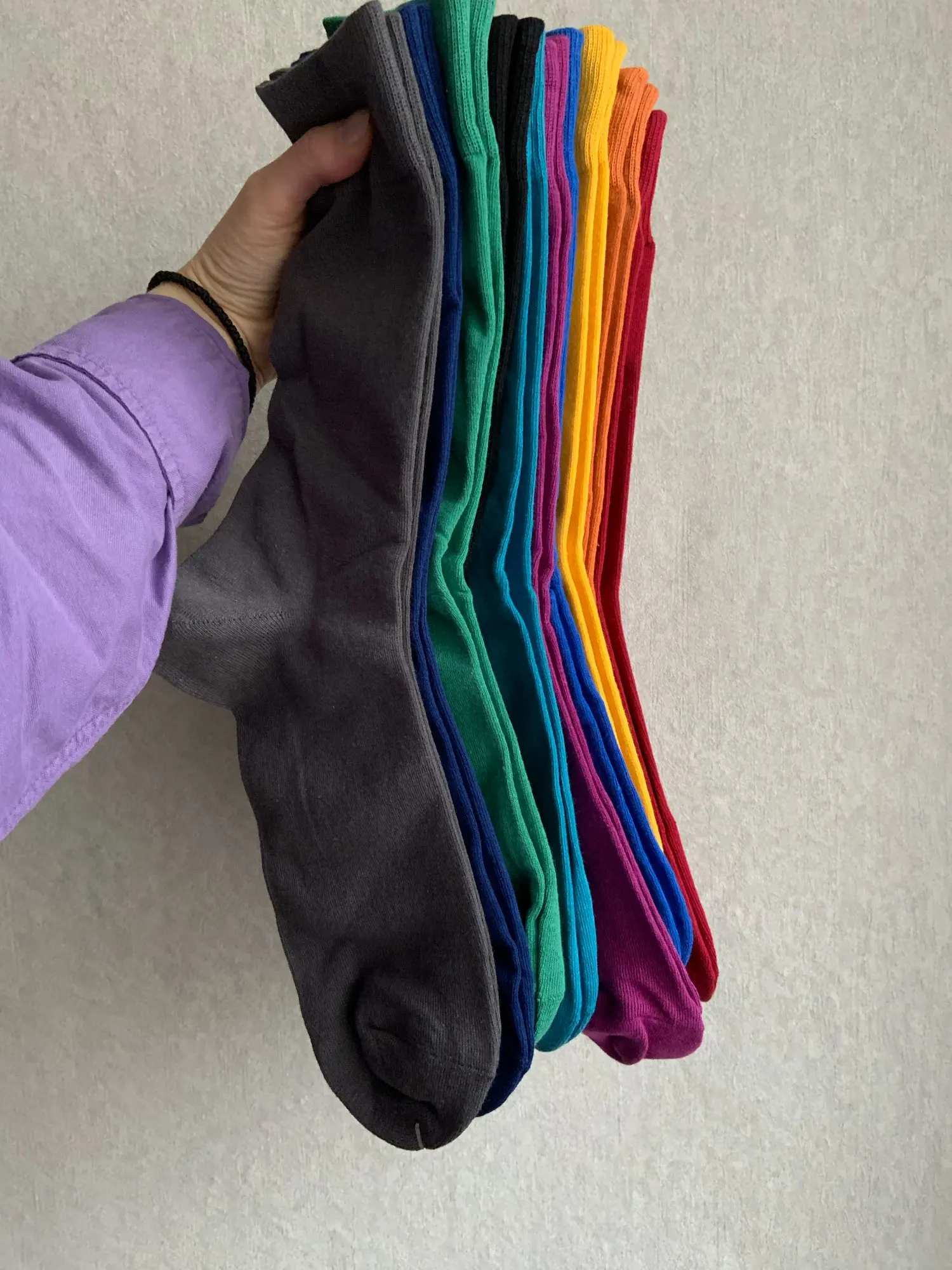 Заказали с подружкой специально, чтобы комбинировать разные пары по цветам. На наши 39 и 40 размеры носки большие, пятка на уровне ахилла. Но для зимних высоких ботинок это ок, особенно учитывая, что носки высокие, резинка на середине икры. И что важно, она не сползает, носок гармошкой не собирается! Ставим носкам лайк и рекомендуем к покупке