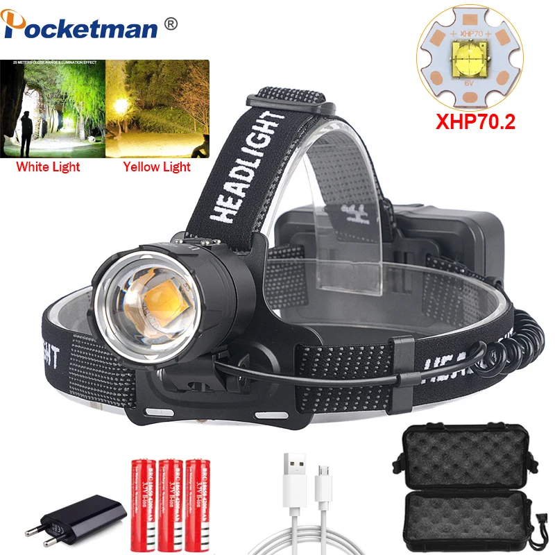 8000LM XHP70.2 светодиодный налобный фонарь XHP70 самый мощный желтый или белый светодиодный фонарь для рыбалки, кемпинга, зум-фонарь, 3*18650 батареи