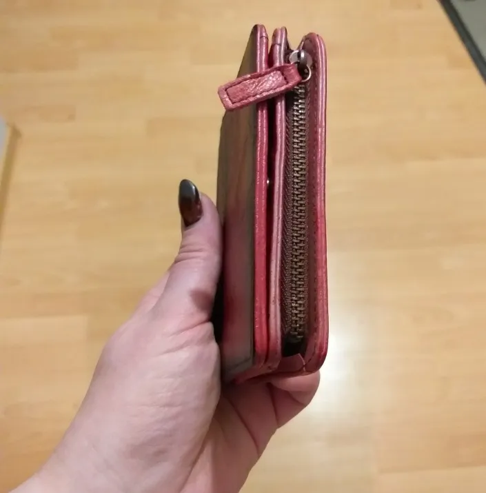 Хороший кожаный кошелёк, н чего лишнего, все необходимые отделения. Плоховато ходит замок. Цвет как на картинке, есть пятнышко.