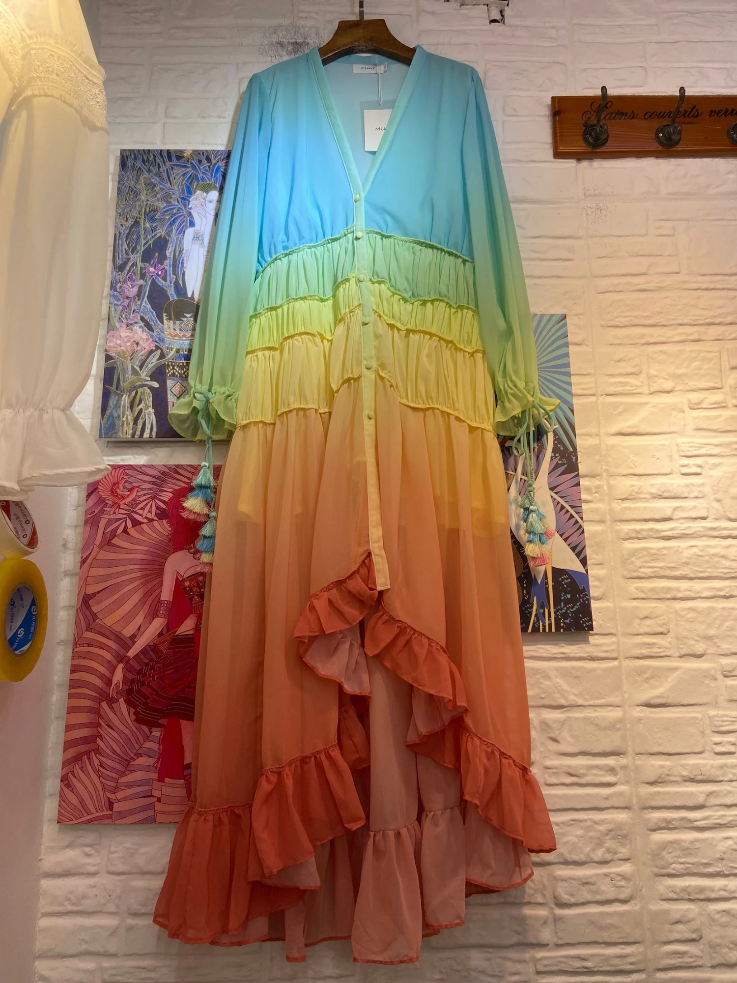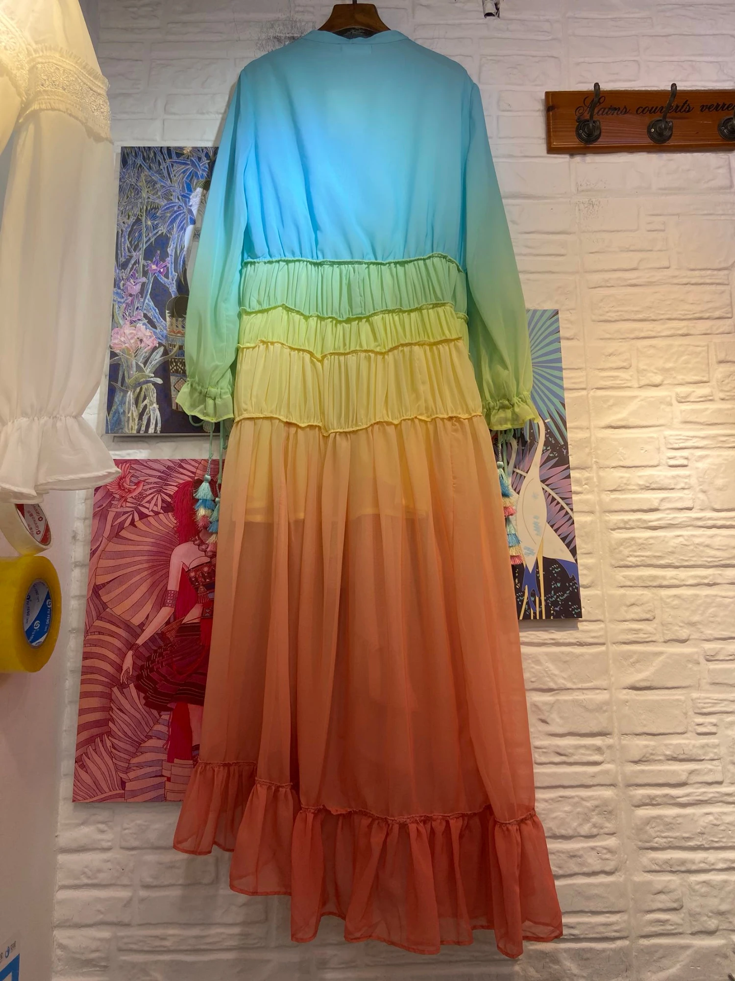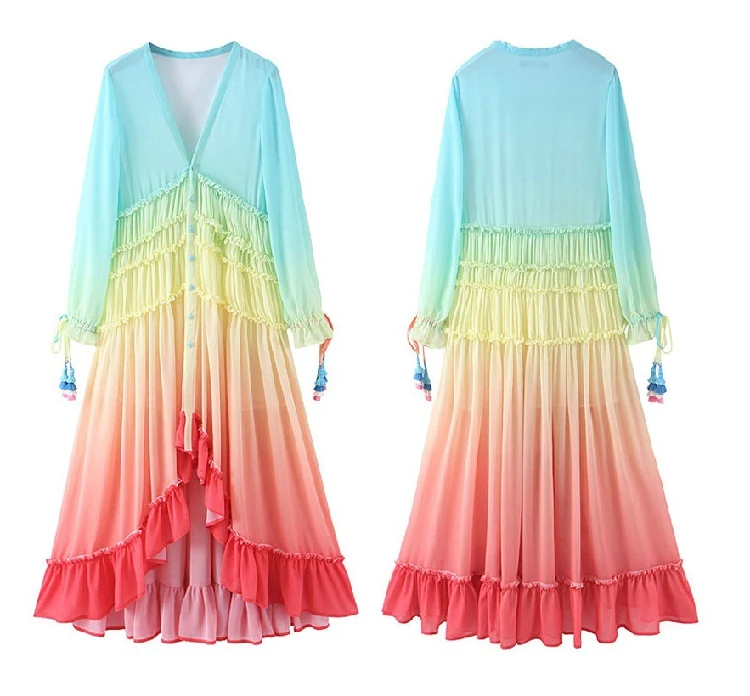 Женское длинное платье с оборками, Повседневное платье с длинным рукавом, глубоким V-образным вырезом и градиентным переходом цветов в богемном стиле для пляжа и отдыха, осень