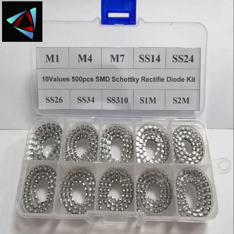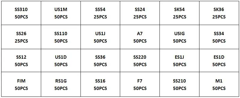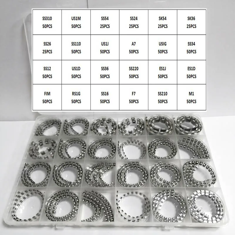 Набор выпрямительных диодов SMD SS310, SK54, SS110, 1N5822, 1N4007, ES1J, FR107 M1, SR2100, 1N5817, SS16, S1M, S2M, SMA, Шоттки, 24 значения, 1075 шт.