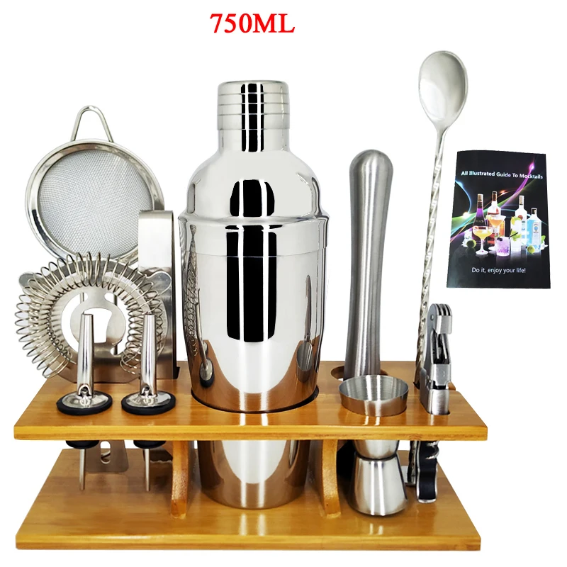 Набор барный из 11 предметов, 750 мл, набор коктейльных шейкеров со стильной деревянной подставкой и буклет для рецептов, идеальный домашний набор для бара с барными инструментами