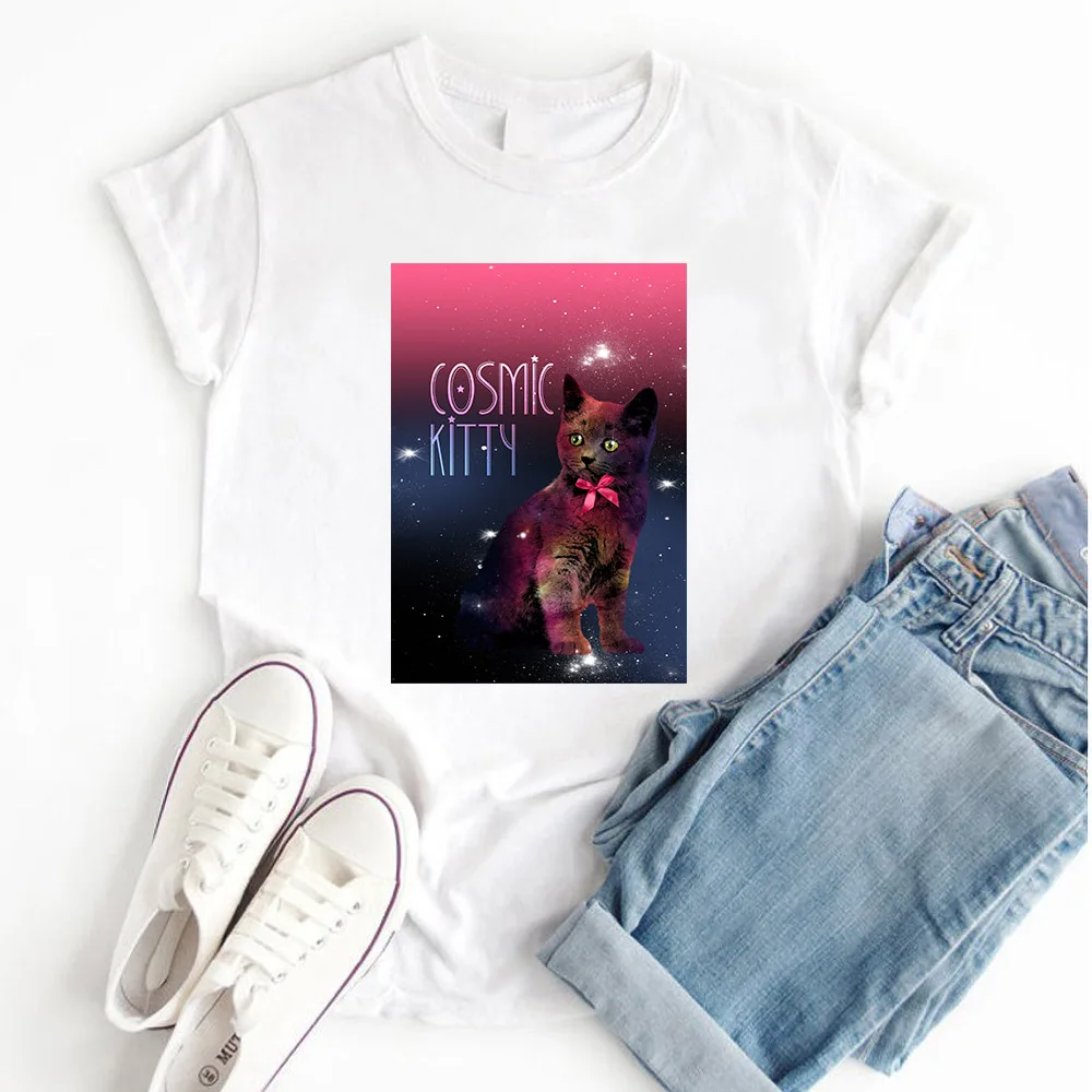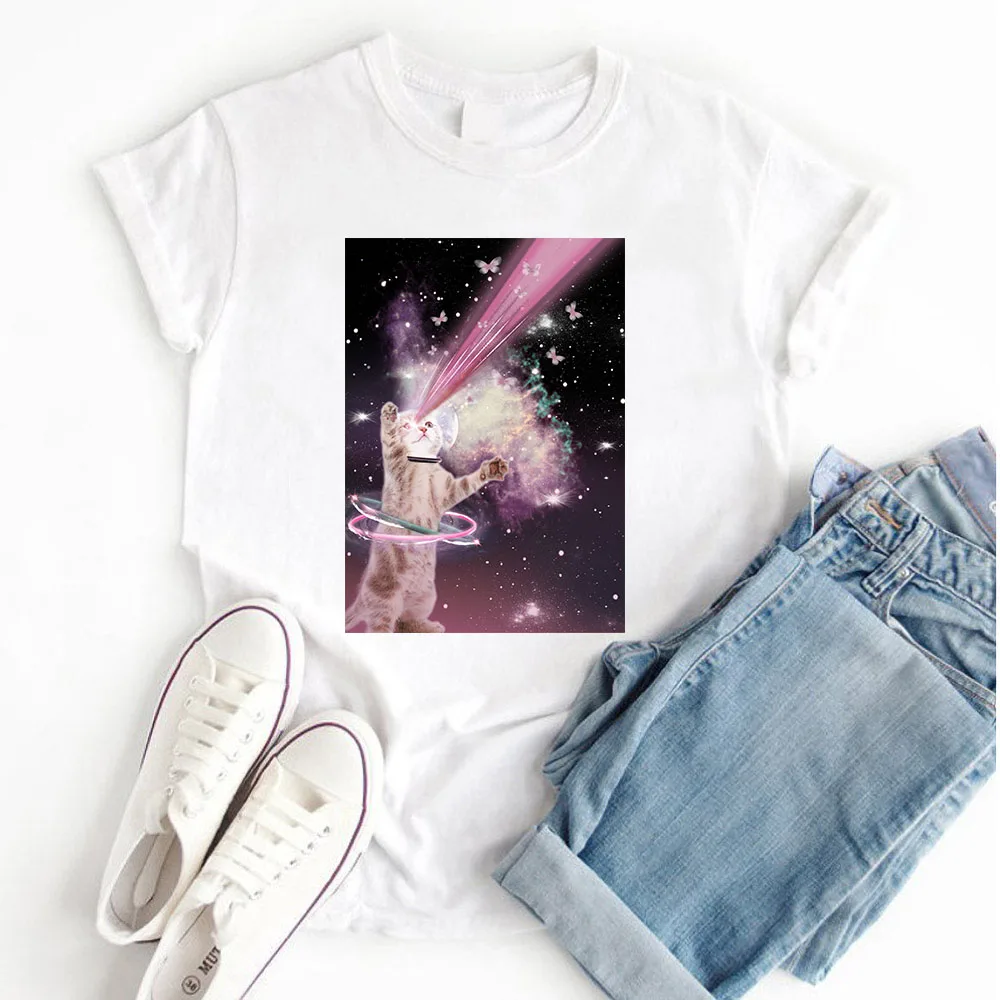Женская футболка BLINGPAW, с забавным принтом в виде кота и космоса, винтажные Мультяшные Топы И Футболки из 100% хлопка, Брендовые повседневные женские футболки с аниме-принтом