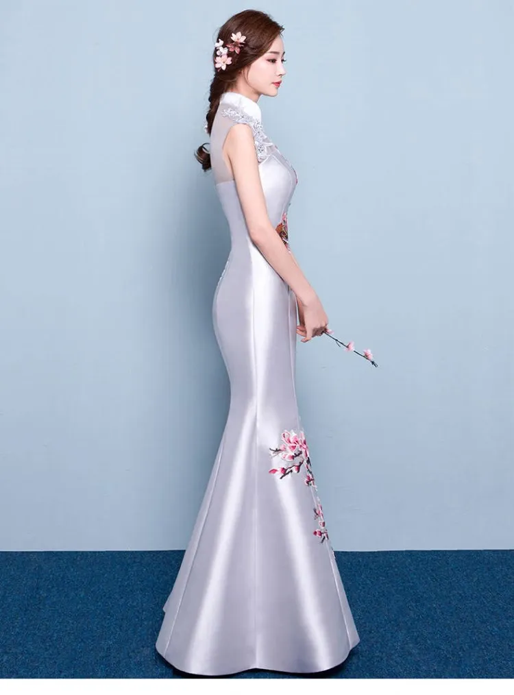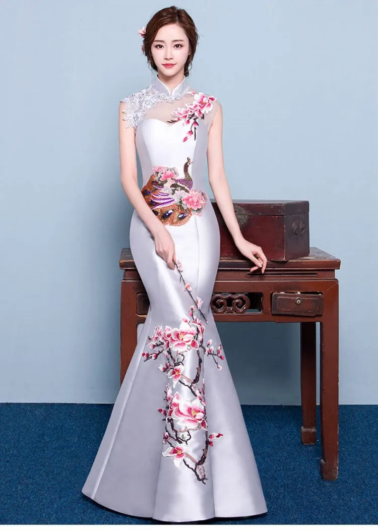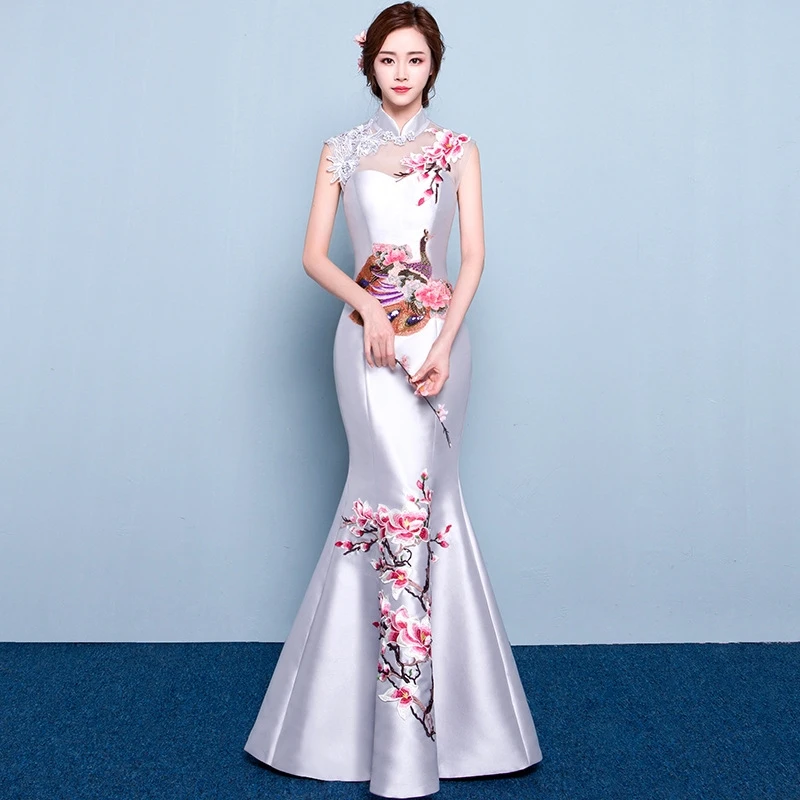 Восточное вечернее платье в китайском стиле, модное пикантное длинное платье-Ципао с вышивкой павлина, женское платье