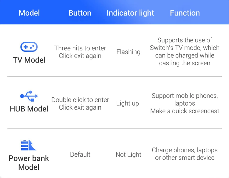 Три нажатия кнопки «функция» для входа в режим телевизора, мигает синий индикатор-светильник* С кабелем передачи данных в посылка, после подключения USB-C2 порта банка питания, в режиме ТВ, вы можете использовать порт HDMI для подключения к большому экрану.