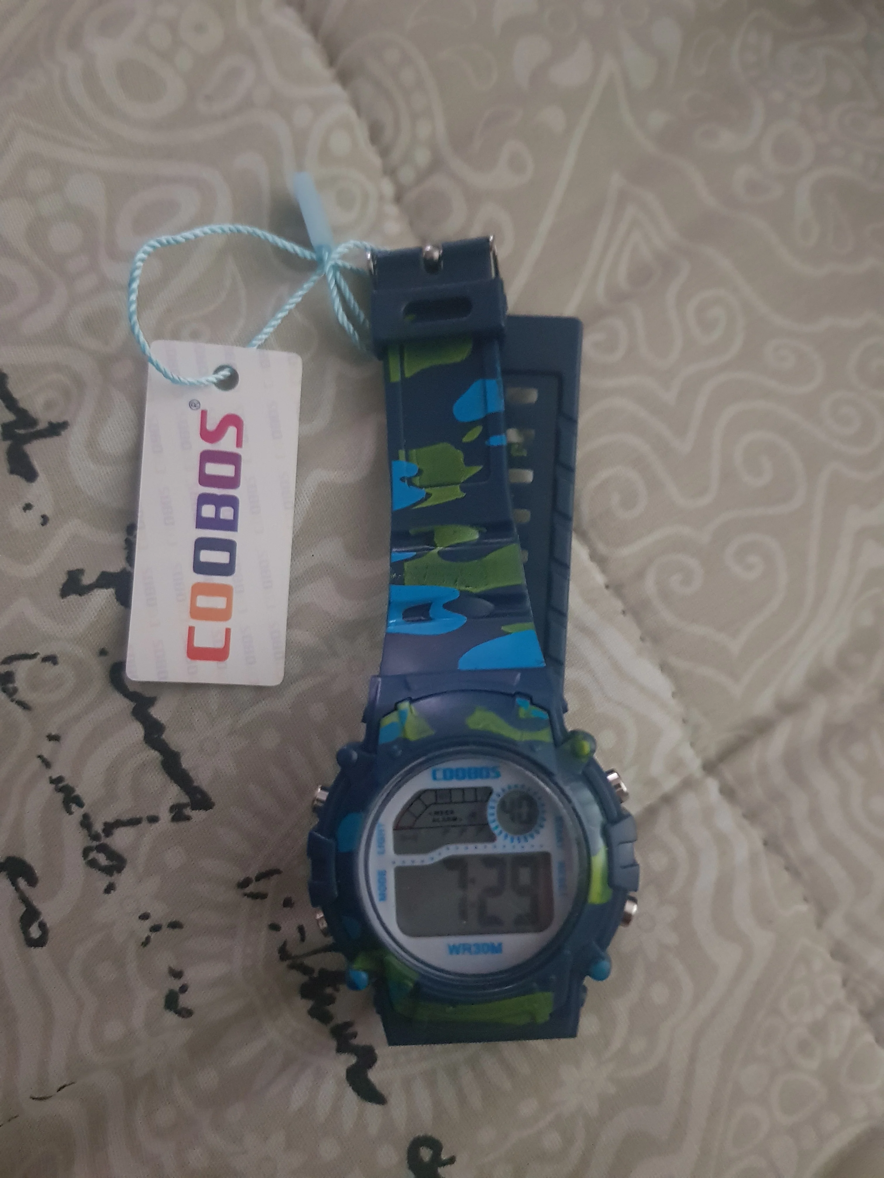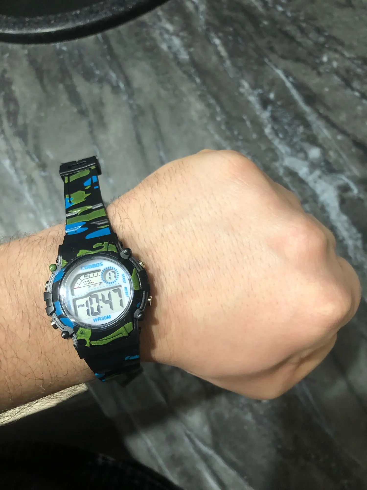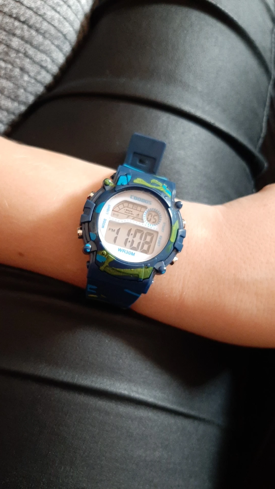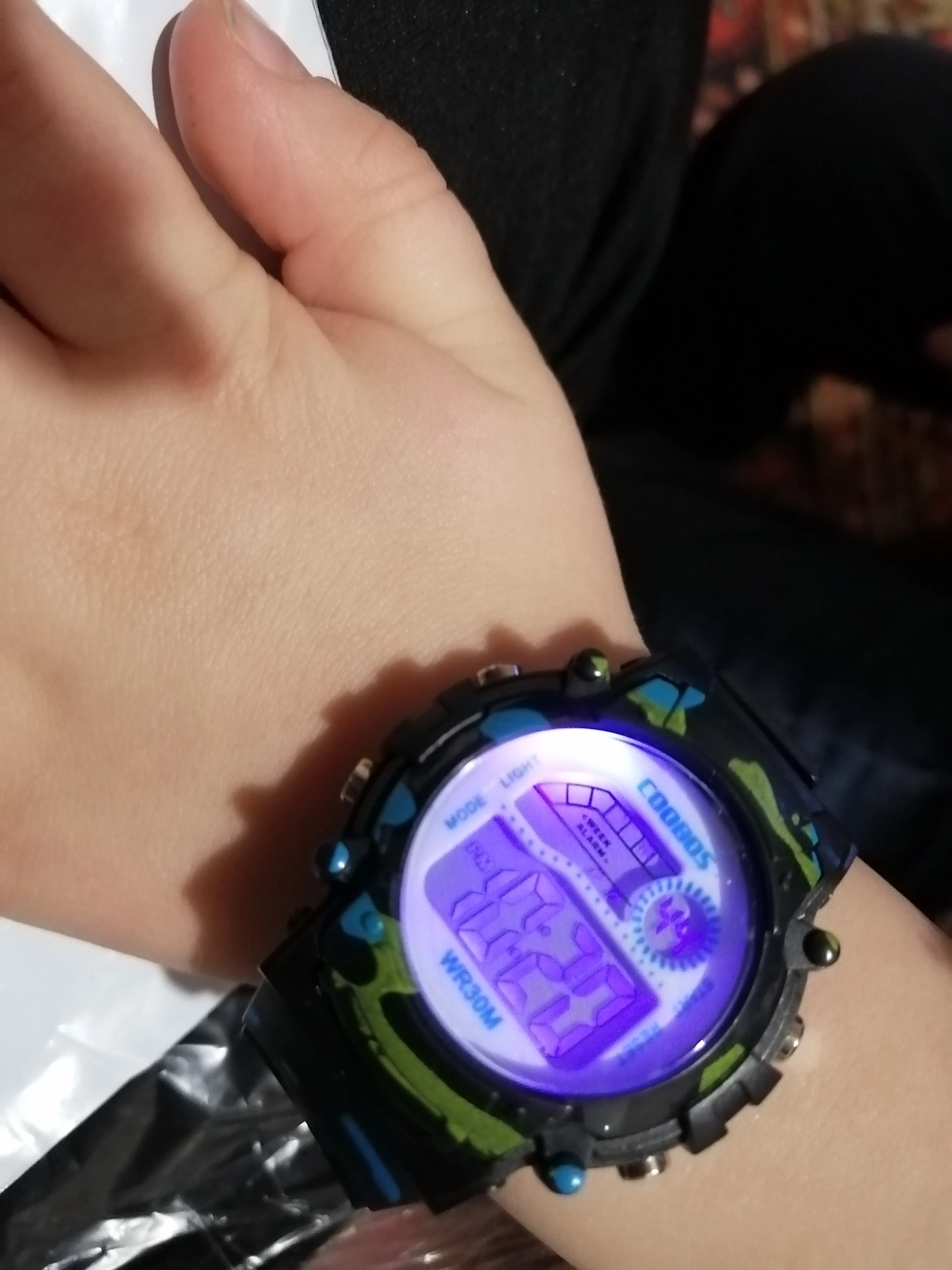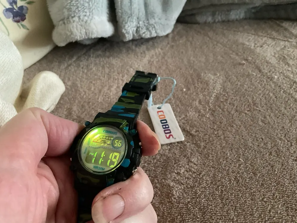Часы пришли относительно быстро в Украину. Упакованны в пупырку, есть инструкция на англ и китайском. Ро кнопкам интуитивно понятно:секундомер/подсветка/установка времени и дней недели. На руку 5 летнего ремешок застегивается на последнее деление, делений в ремешке много. Корпус и ремешок из пластика.