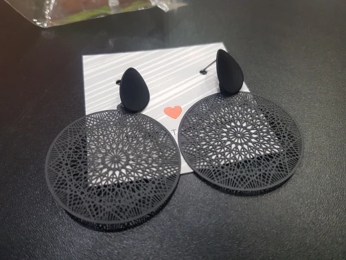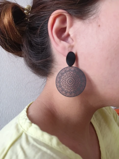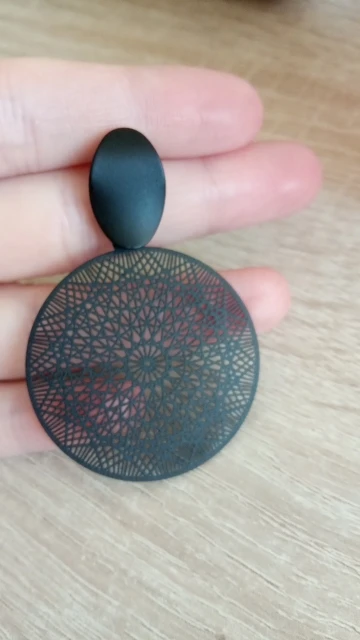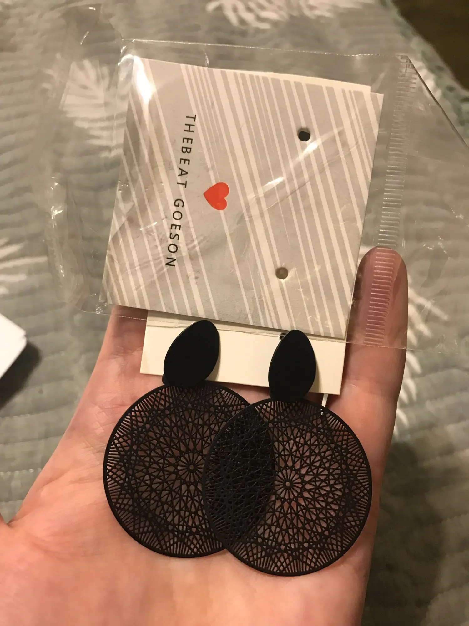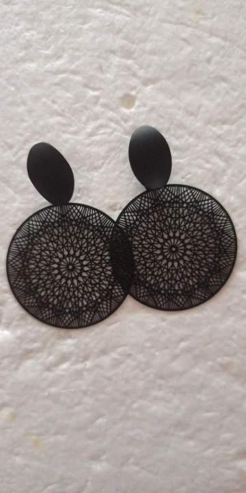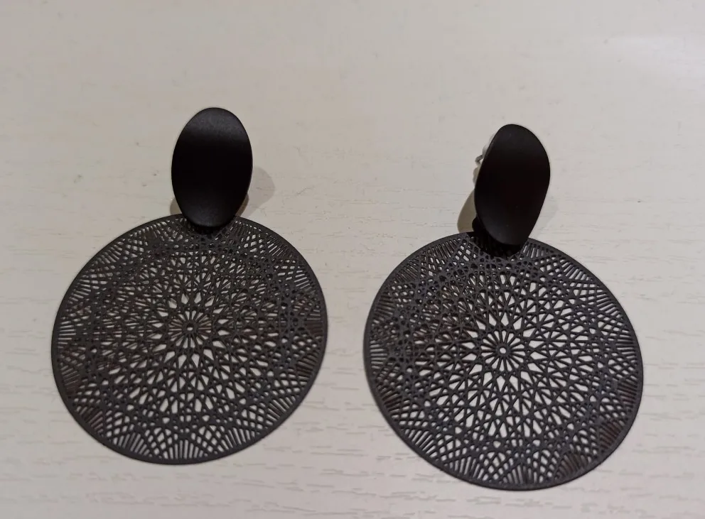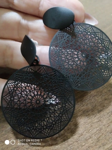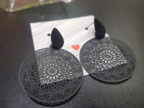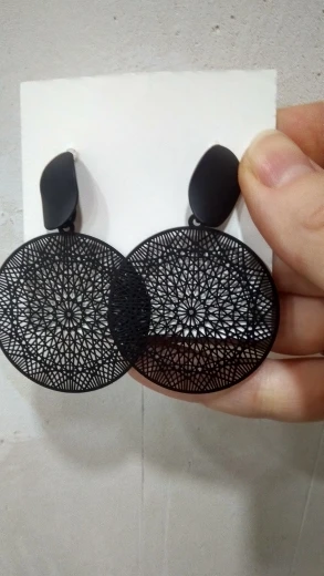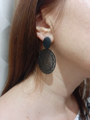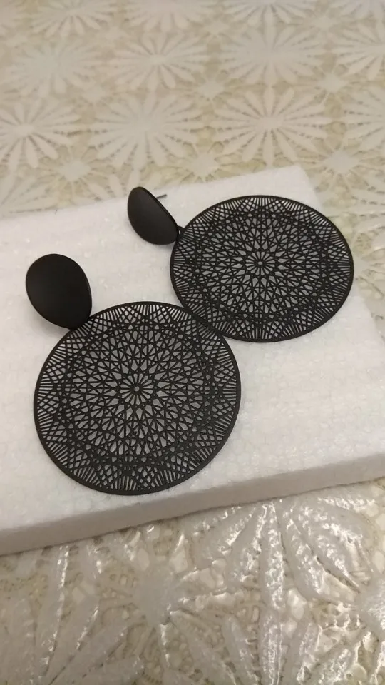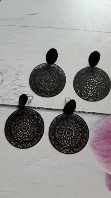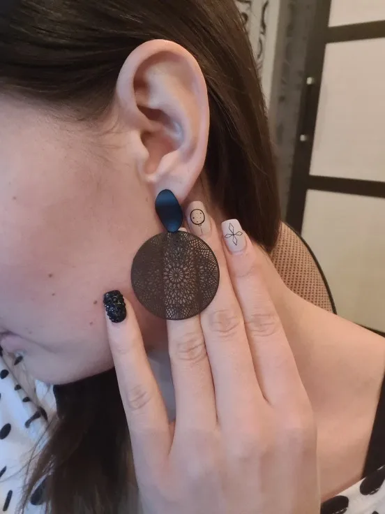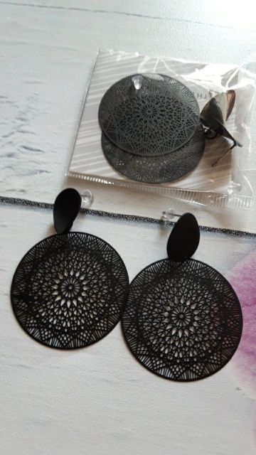 Красивые, тонкие, легкие серьги. Доставка три недели, т. к. объединили с другими товарами. Вроде металл, но не магнитятся. На одной колечко припаяно кривовато, но в глаза не бросается, да и стоимость низкая (50 р). Других недостатков не нашла. Толщина примерно 0,2 мм, так что легкие, в ушах не ощущаются, если головой не крутить. Упаковка - тонкий пакетик, плюс почтовый пупырчатый. Подозреваю, что погнулись бы, если бы не объединение посылок. Несколько раз носила по 3-4 часа, уши не болели. Мои уши в целом нечасто реагируют на серьги. Цвет - черный матовый.