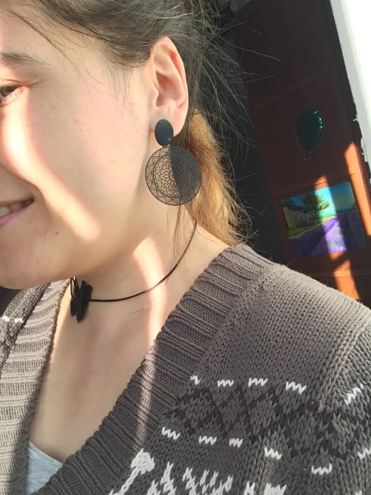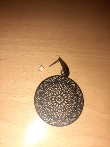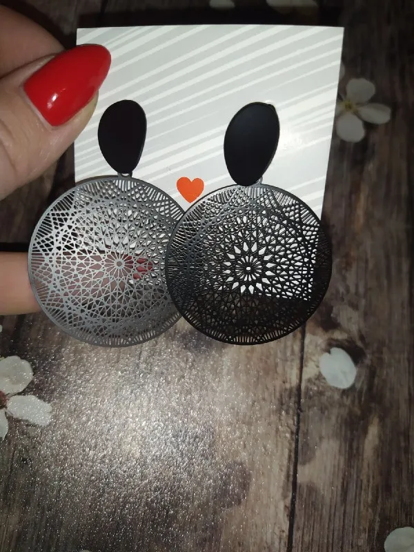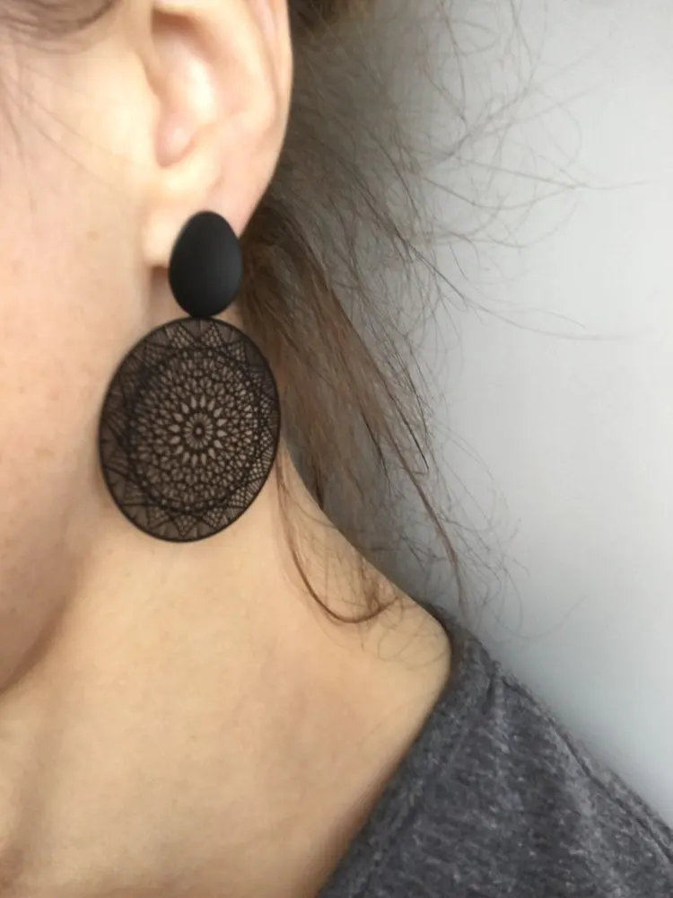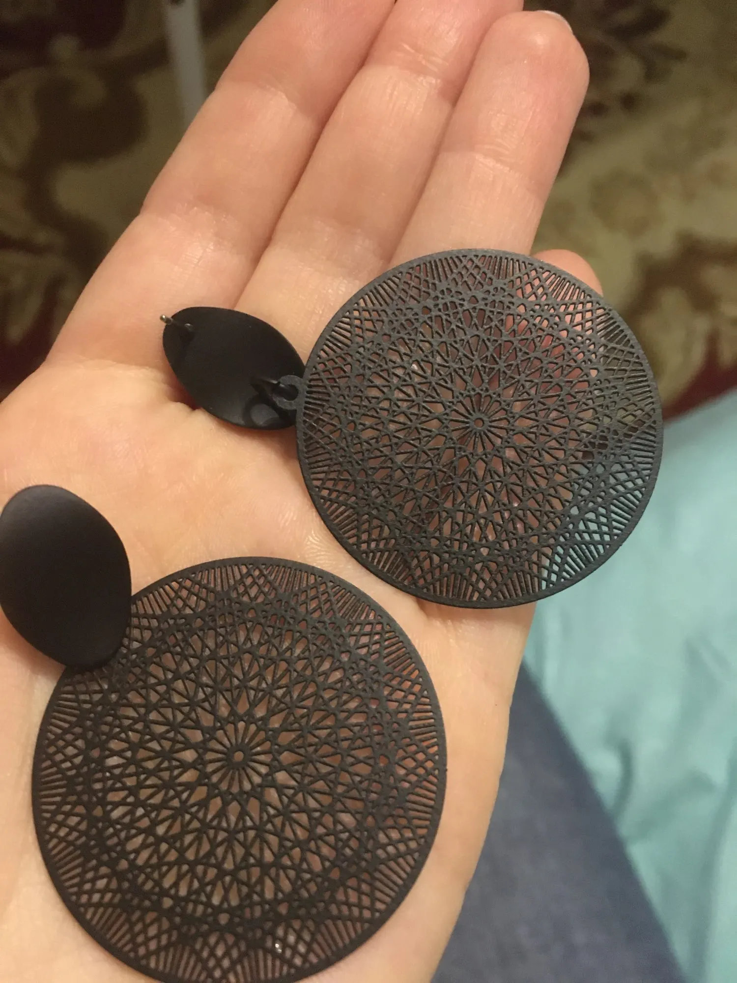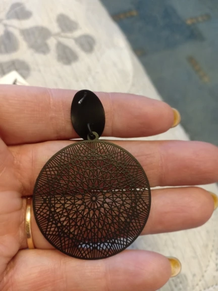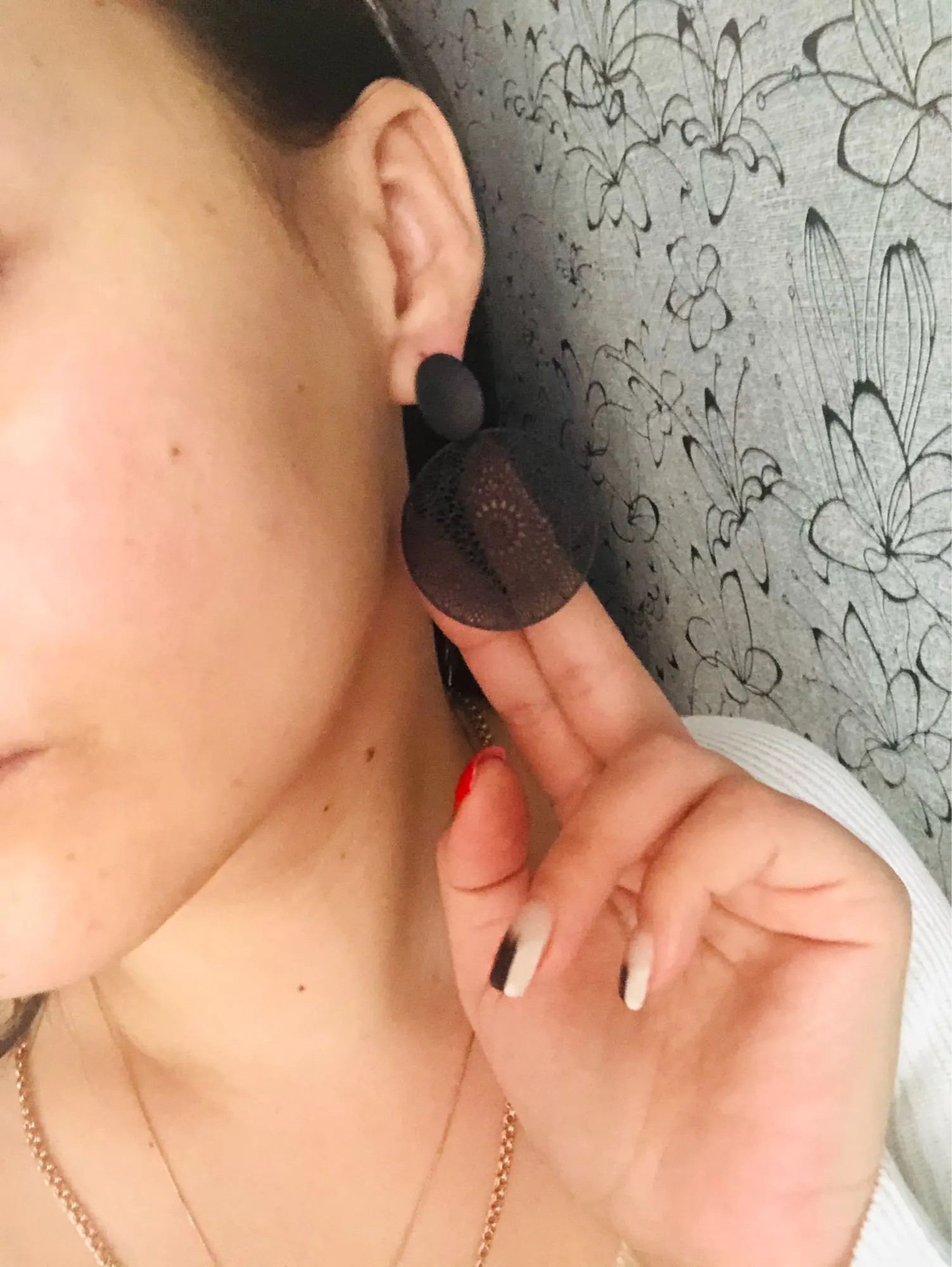 Красивые, тонкие, легкие серьги. Доставка три недели, т. к. объединили с другими товарами. Вроде металл, но не магнитятся. На одной колечко припаяно кривовато, но в глаза не бросается, да и стоимость низкая (50 р). Других недостатков не нашла. Толщина примерно 0,2 мм, так что легкие, в ушах не ощущаются, если головой не крутить. Упаковка - тонкий пакетик, плюс почтовый пупырчатый. Подозреваю, что погнулись бы, если бы не объединение посылок. Несколько раз носила по 3-4 часа, уши не болели. Мои уши в целом нечасто реагируют на серьги. Цвет - черный матовый.