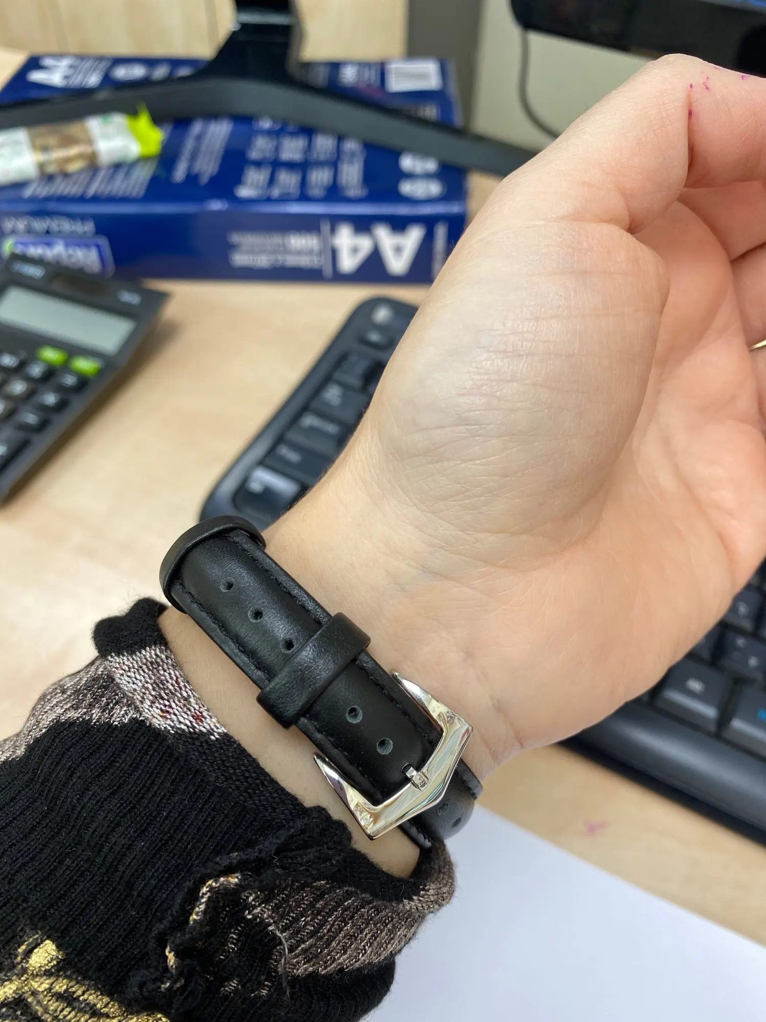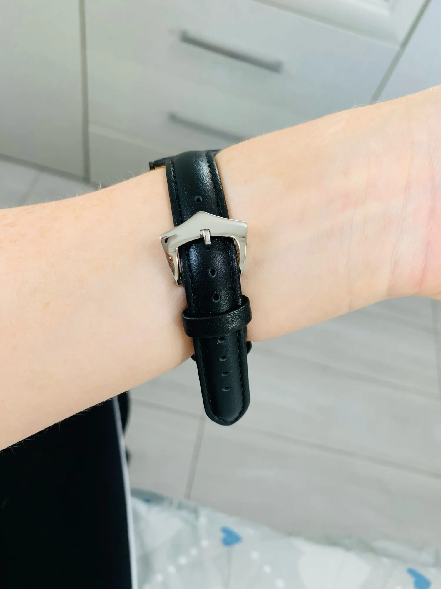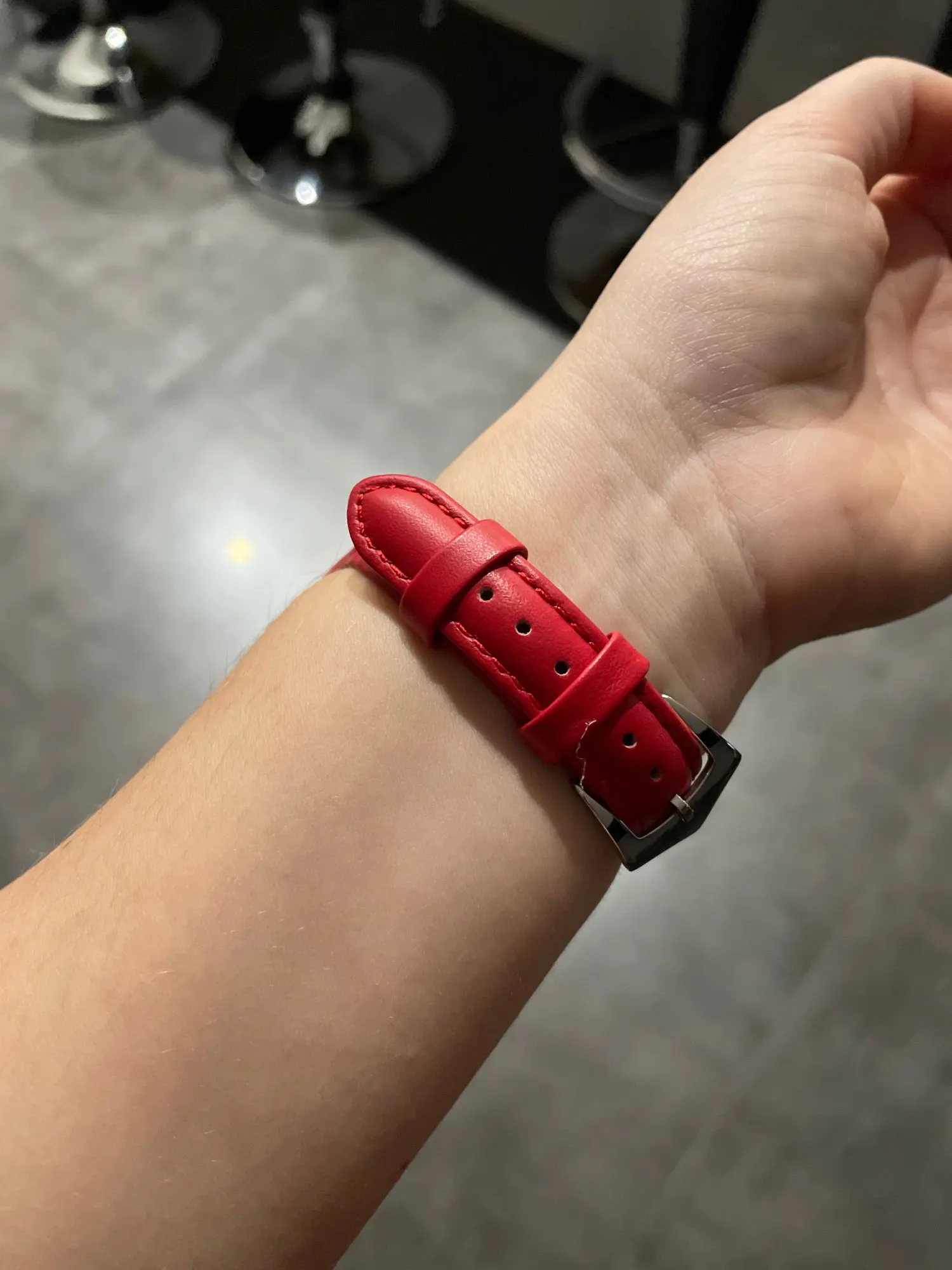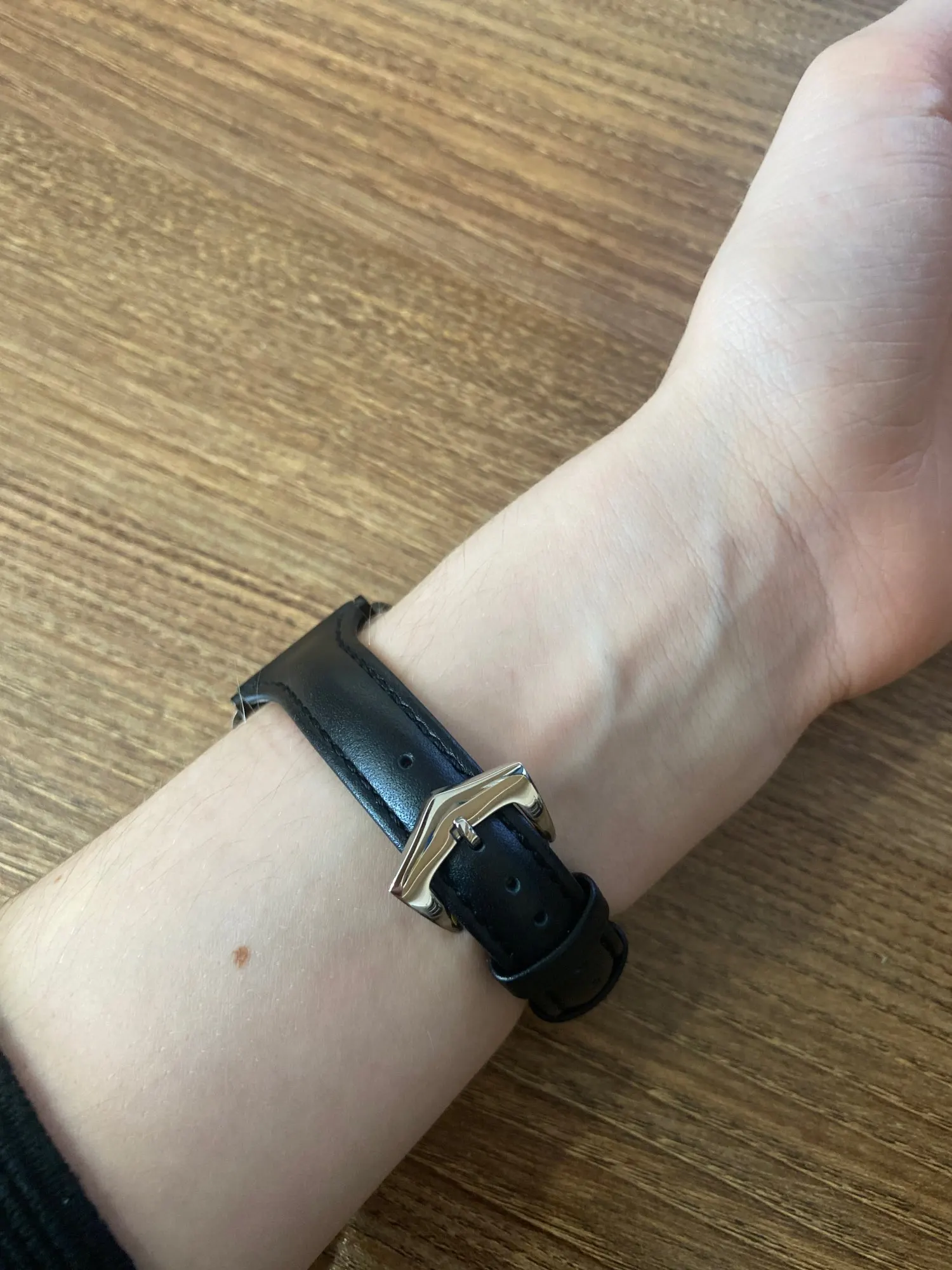 Ремешок пахнет кожей) жёсткий, перелавливает руку ( на фото видно) если расслабить то часы не будут прилагать к руке. Есть не большой брак, но они прошиты по этому не открываю спор. В общем довольна