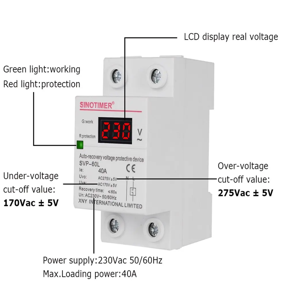 SINOTIMER SVP-60L 230 В 40 А автоматическое восстановление под напряжением Защита от перенапряжения релейный выключатель защитное устройство светодиодный дисплейОсобенности:1. Стабильная производительность: печатные платы продуктов изготовлены из высококачественных электронных компонентов с более длительным сроком службы и более надежной производительностью.2. Простая установка: Стандартная направляющая 35 мм, простая установка.3. Простота в эксплуатации: устройство автоматического восстановления перенапряжения и защиты от пониженного напряжения соответствует стандартам модульной конструкции, его использование и техническое обслуживание очень просты.4. Сигнасветильник: Зеленый индикатор отображается при нормальном питании. Красный индикатор отображается при перенапряжении или пониженном напряжении питания.5. Четкое чтение: сверхчеткий светодиодный дисплей и Сверхширокий угол обзора, чтение напряжения можно легко увидеть в любое время.6. Функция: как только напряжение превышает ограниченный диапазон продуктов, он автоматически отключится, чтобы защитить безопасность электрооборудования и людей. Устройство перезаряжается, когда питание вернется к нормальному.