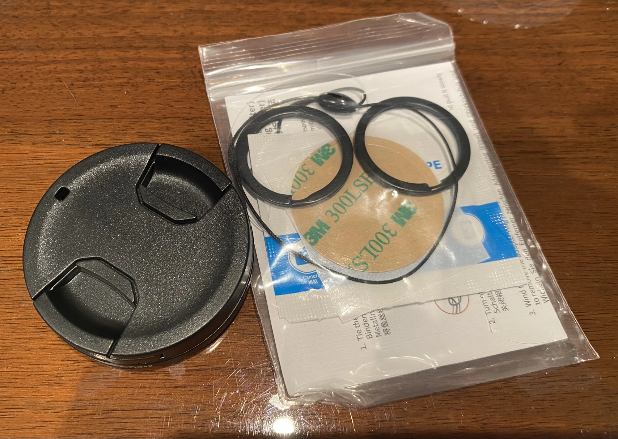 Поставляется с крышкой объектива ф49мм, держателем крышки объектива и запасной клейкой наклейкой 3M