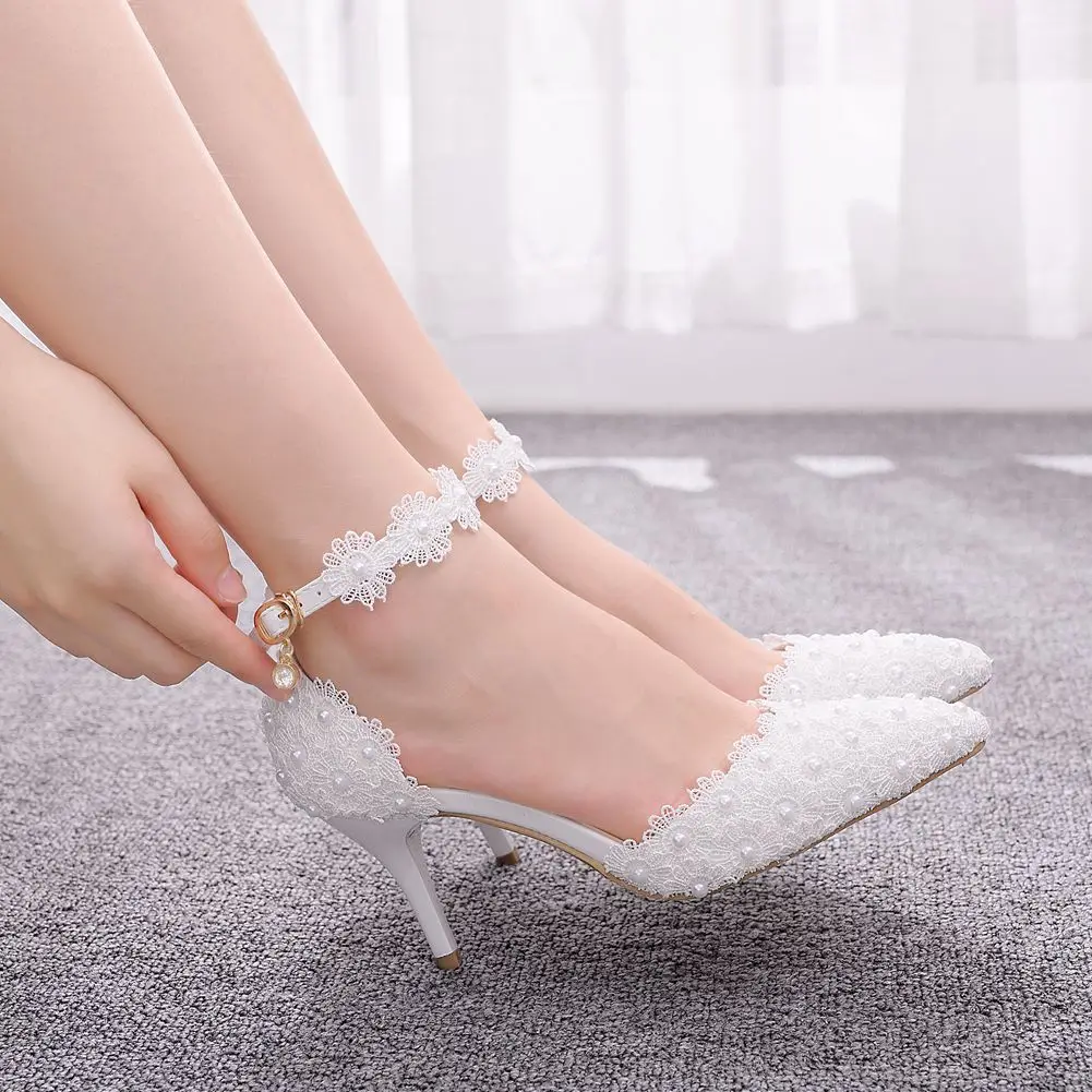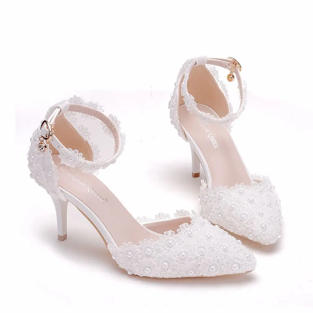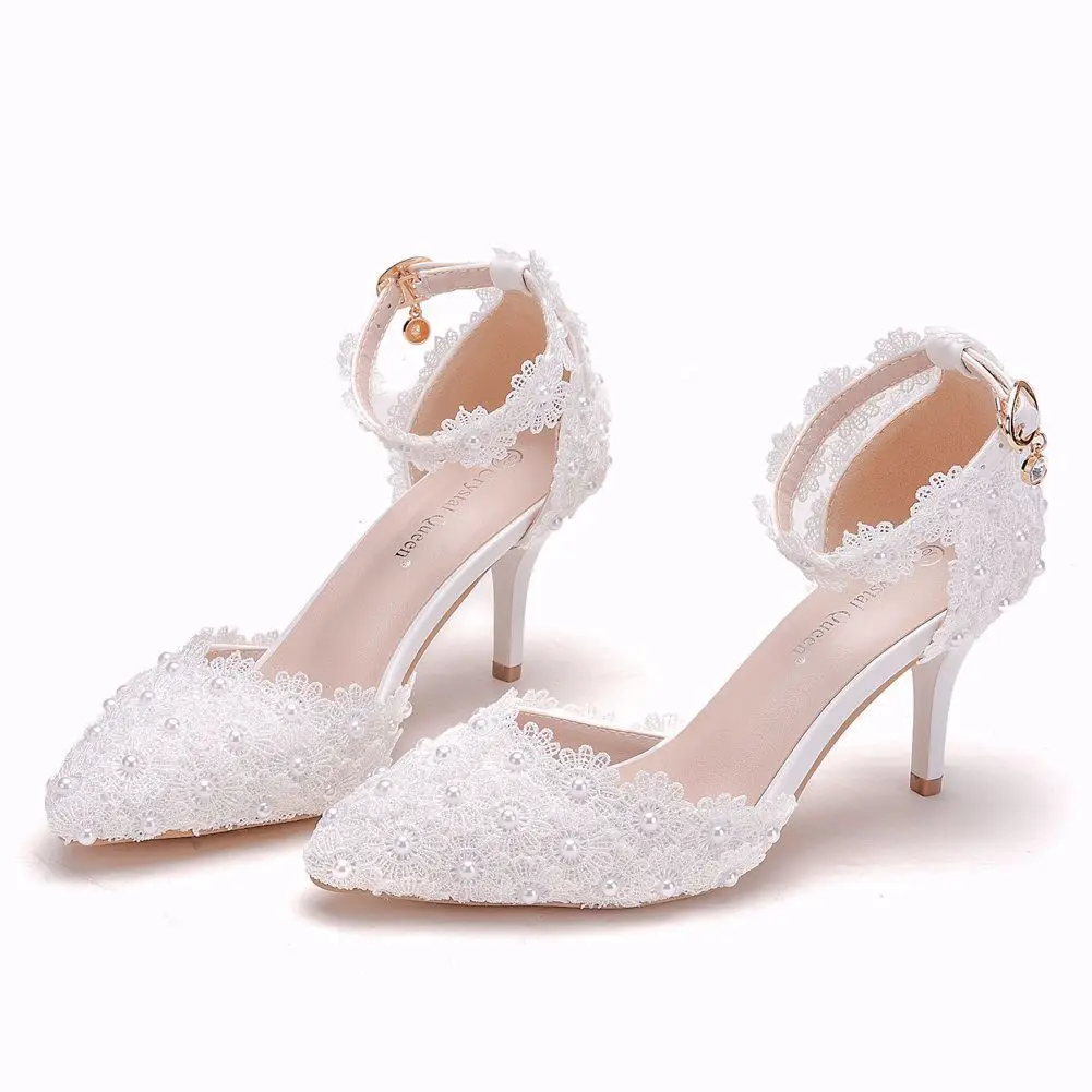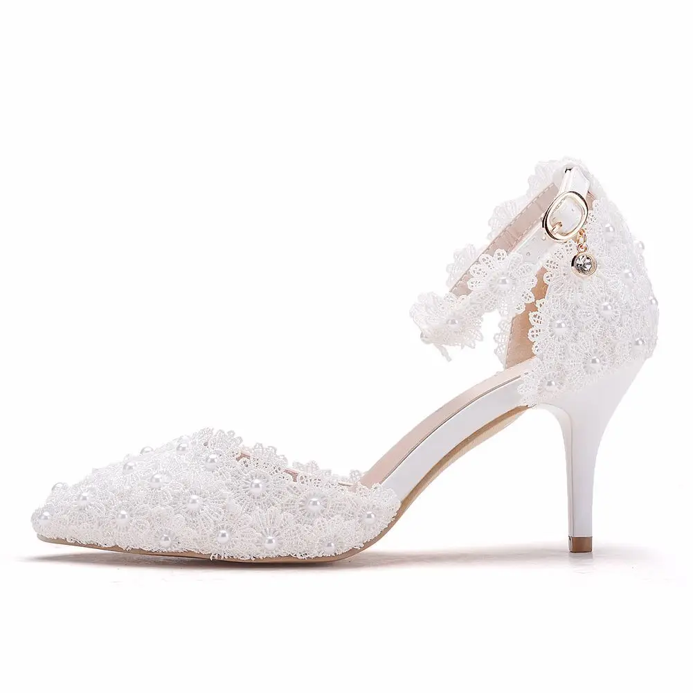 7,5 см белые кружевные свадебные туфли невесты на тонком каблуке од...