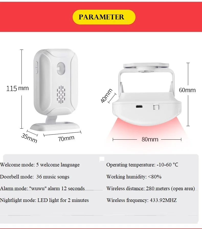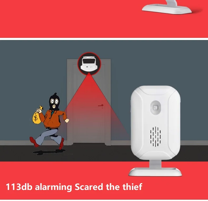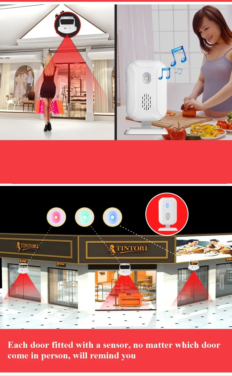 Хранитель магазина в дневное время, анти-вор в ночное время. Поместите датчик движения PIR на входе в подъездную дорогу или в любом месте, где вы хотите быть предупреждены о motion, он обнаруживает движения и посылает беспроводной сигнал на портативный приемник от 918 футов (280 м) далеко.5-в-1, которые поддерживают несколько режимов (добро пожаловать/дверные звонки которой отображаются индикаторы хронографа, будильника или звукового сигнала красочные светильник/Ночной светильник).Музыкальный чип 8 chord, большой звуковой сигнал 40 мм, мелодии 36 chime, Помните последнюю настройку мелодии и уровня громкости, когда-то выключено.Цветной светодиодный светильник, регулируемая яркость, различные входы разных цветов.4 этапа регулируемого объема (громкий/высокий/средний/низкий) от 113 ~ 25 дБ.Приемник может узнать от до 32 беспроводных датчиков, таких как PIR motion, магнитный или вибрационный датчик, а также до 8 удаленных контроллеров.Индикация низкого заряда батареи.Идеально подходит для передних дверей, оконных рам, подъездных дорожек, прогулочных дорожек и в любом месте вашего дома, где вы хотите быть предупреждены о движении. Также отлично подходит для оповещения владельцев бизнеса, которые работают в задней части или вне поля зрения, клиентам, входящим в их магазин.