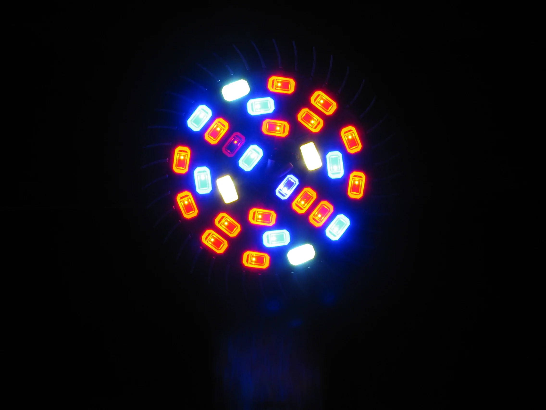 Лампы работают. Ребристый радиатор хорошо отводит тепло от светодиодов. За час работы лампа нагрелась слабо. Значит прослужит долго. Но при этом ток потребления от сети всего 60 миллиампер. Мощность лампы 15Вт максимум, а не 30.