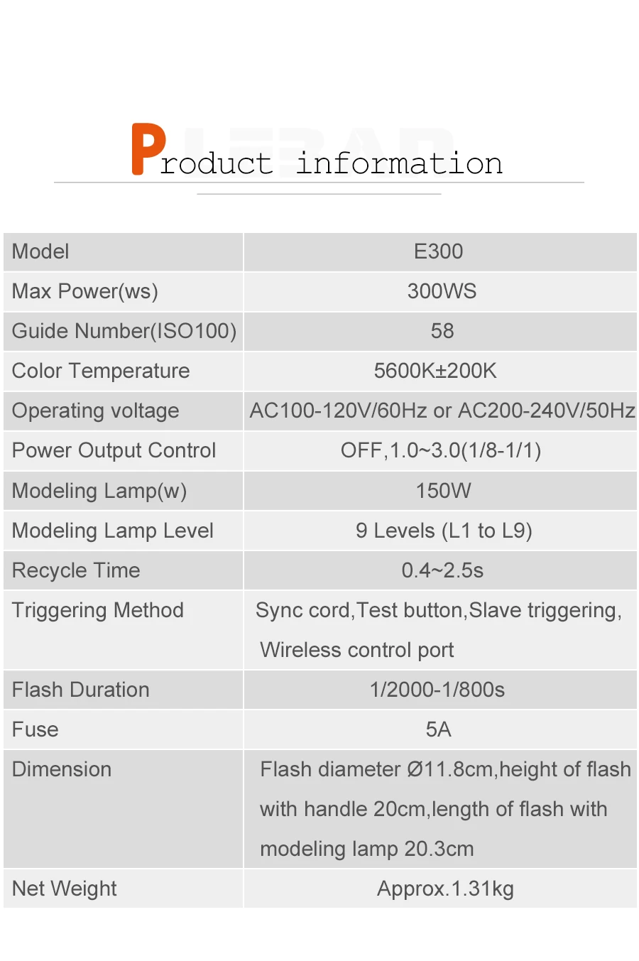 Модель E120 E160 E250 E300 Максимальная мощность (WS) 120WS 160WS 250WS 300WS Направляющий номер (m ISO 100) 38 48 53 58 Цветовая температура 5600200K Рабочее напряжение AC100 ~ 120 В/60 Гц или AC200-240V Гц Контроль выходной мощности 1,0 ~ 3,0 1/8 ~ 1/1 Моделирующая лампа (Вт) 75 Вт 150 Вт Моделирующий уровень лампы 9 уровней (от L1 до L9) Время перезарядки 0,3 ~ 2s 0,4 ~ 5s Метод запуска Шнур синхронизации, Тестовая кнопка, ведомый запуск, беспроводной порт управления Продолжительность вспышки 1/2000 ~ 1/800s Предохранитель 5А Размер Диаметр вспышки 11,8 см, высота вспышки с ручкой 20 см, длина вспышки с моделирующей лампой 20,3 см Вес нетто Прибл. 1,3 кг Прибл. 1,35 кг Прибл. 1,2 кг Прибл. 1,5 кг Посылка