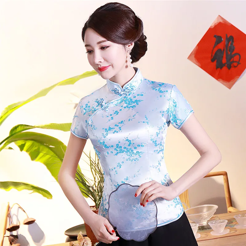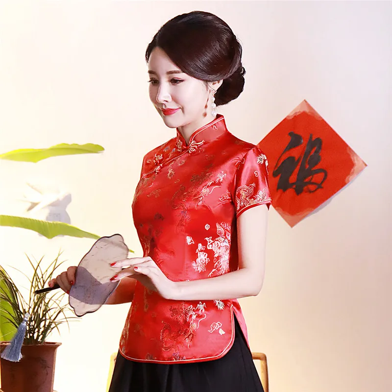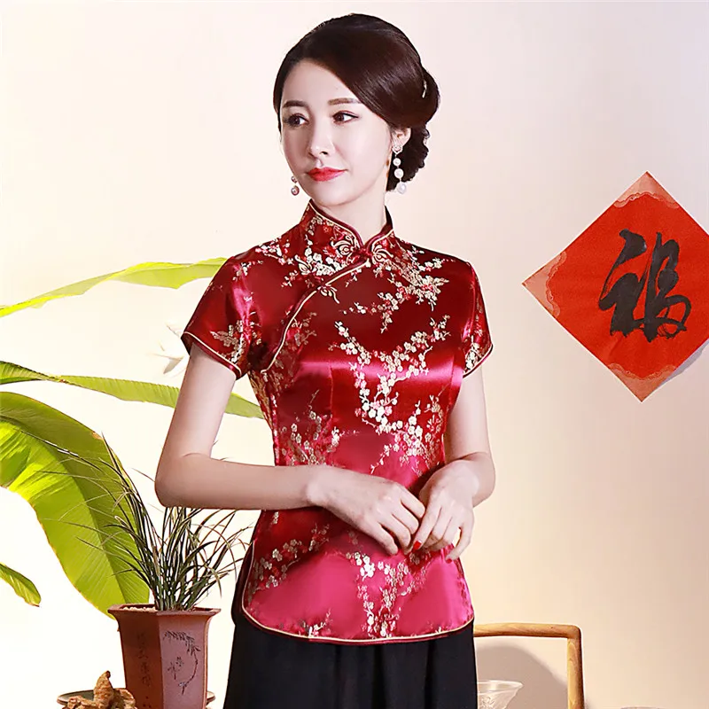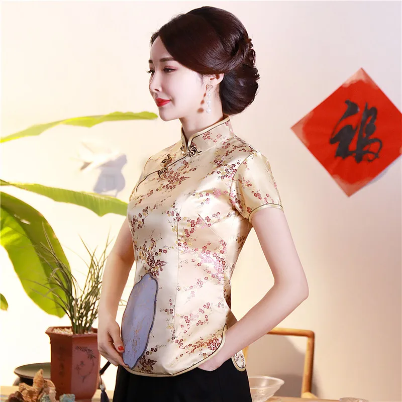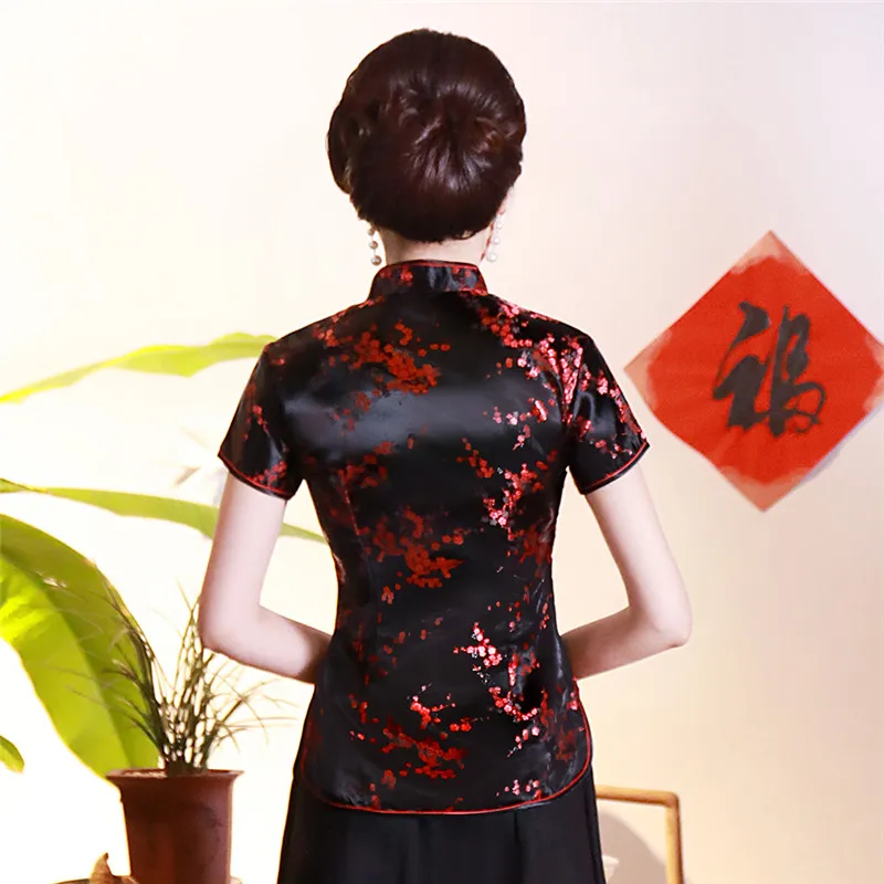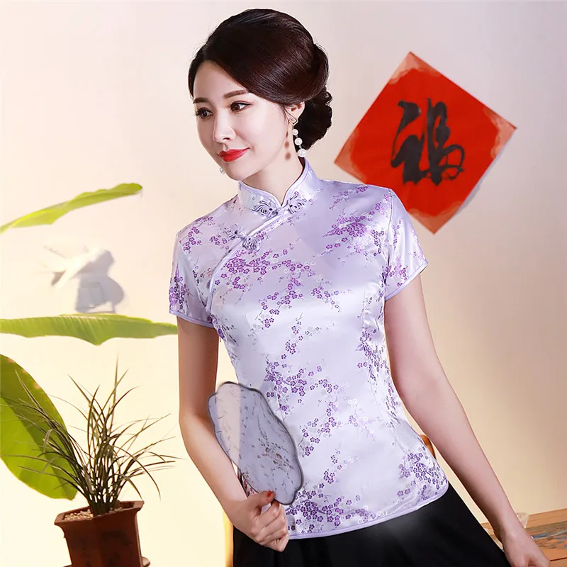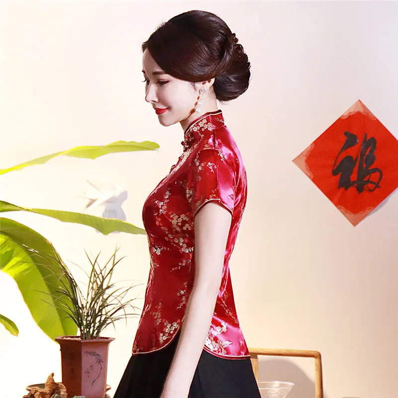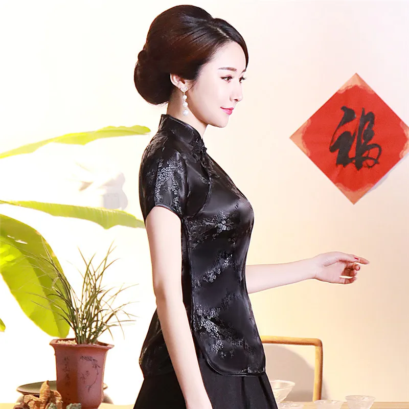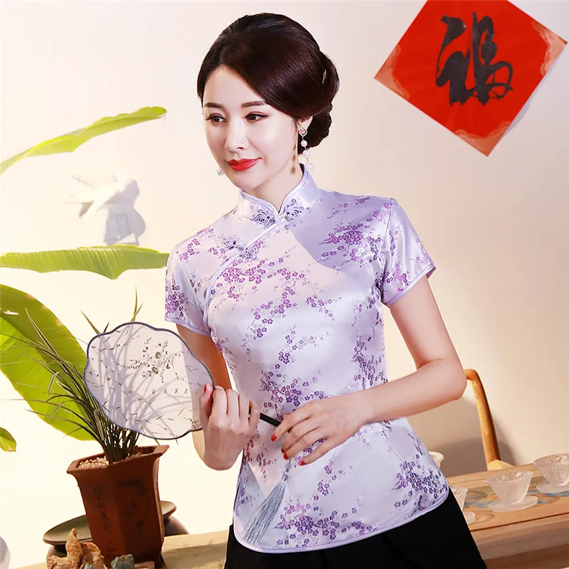 Китайский традиционный женский топ размера плюс 3xl 4xl, атласная блузка с цветами, винтажная рубашка ручной работы на пуговицах, костюм с коротким рукавом