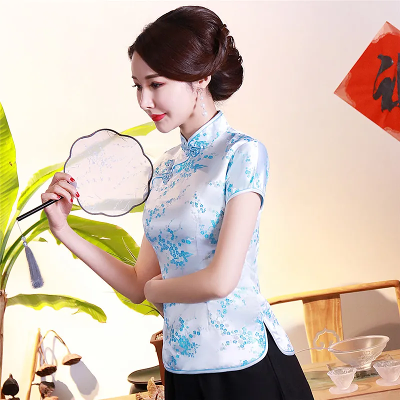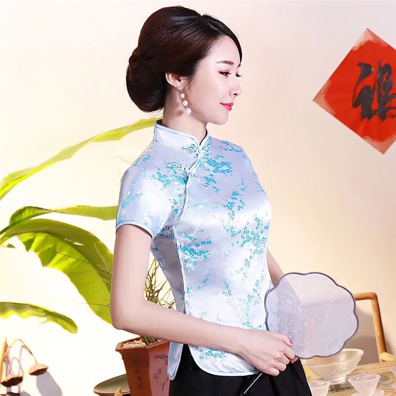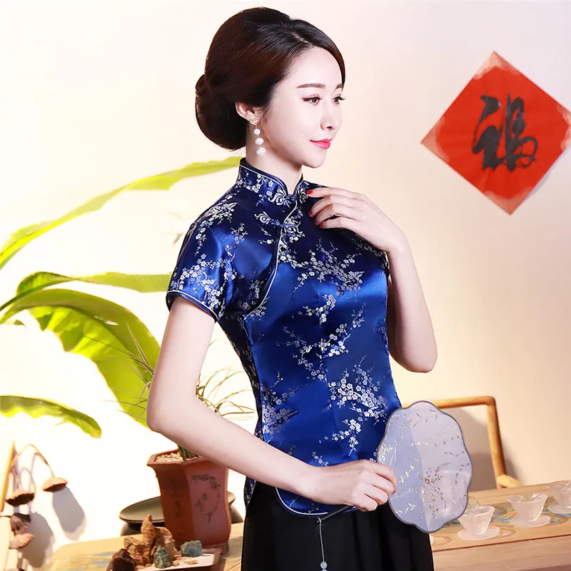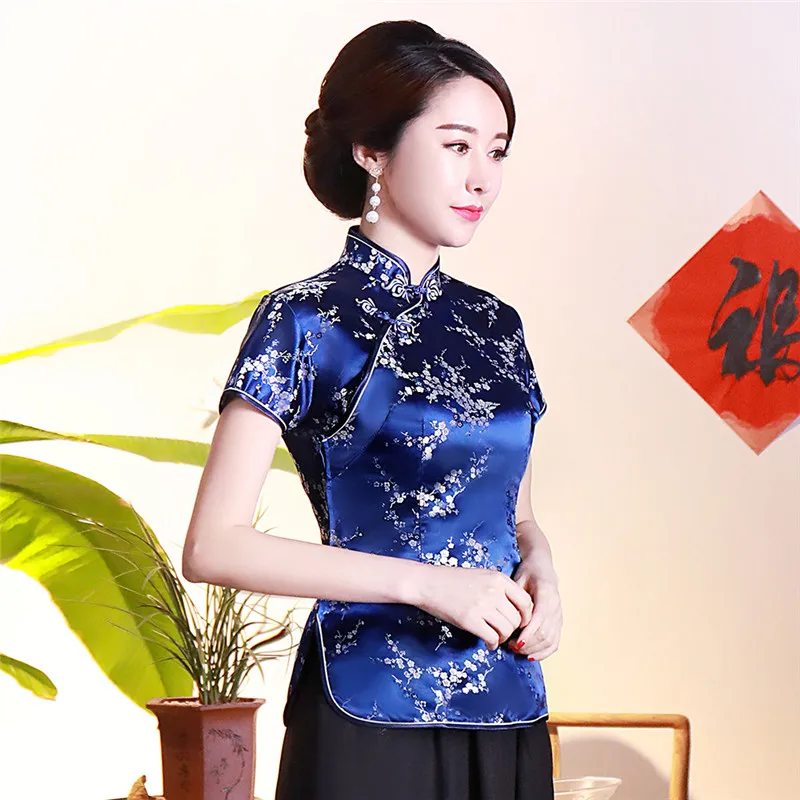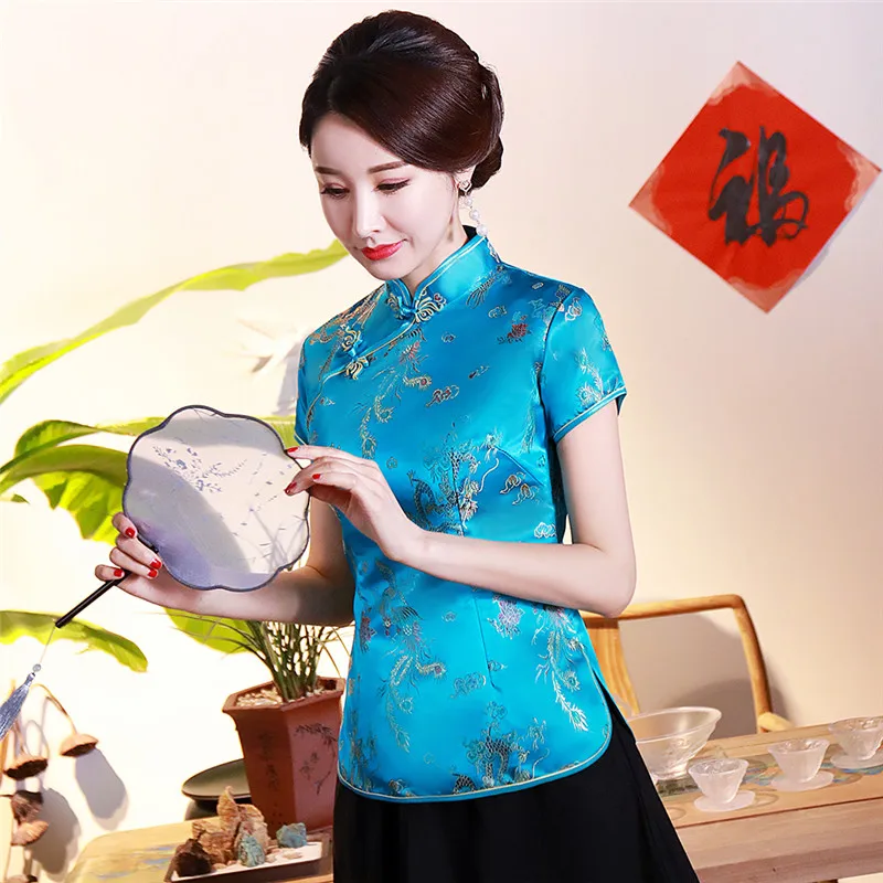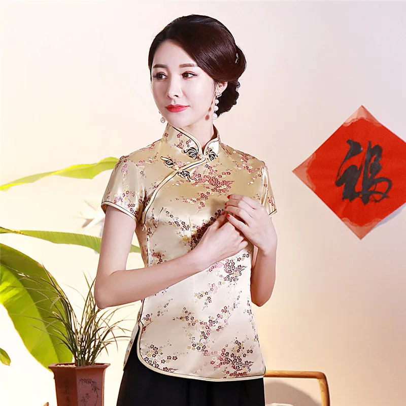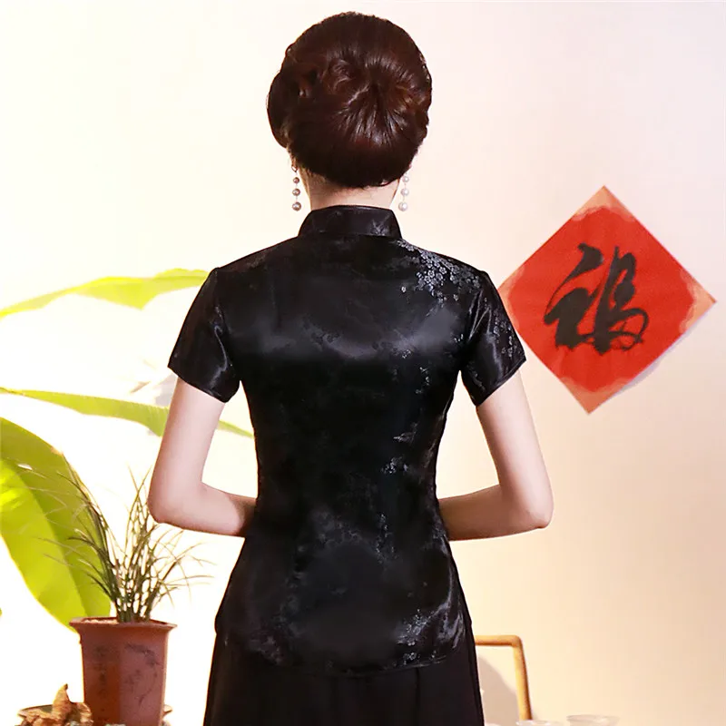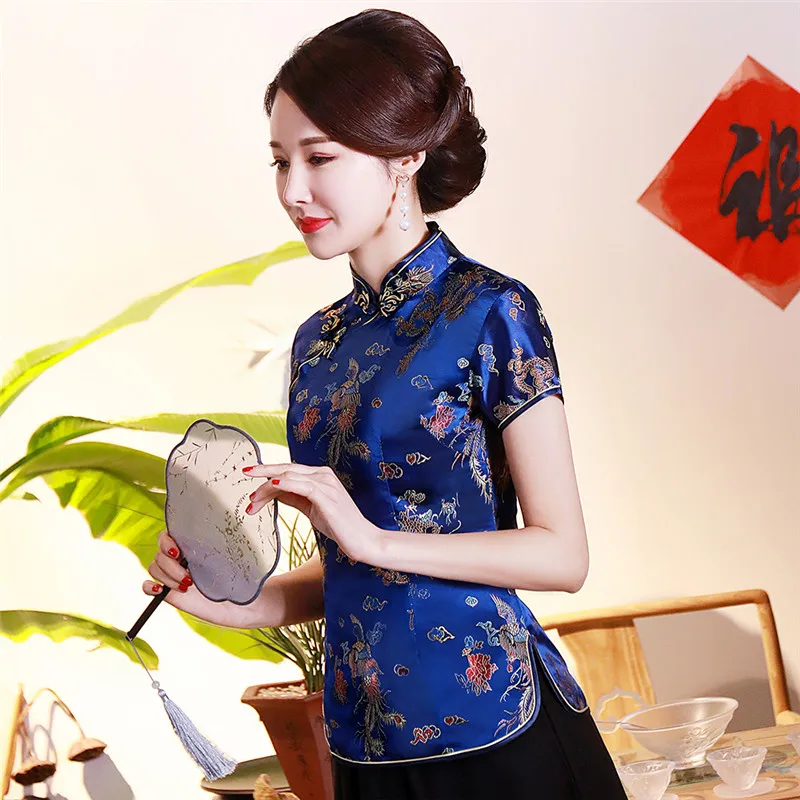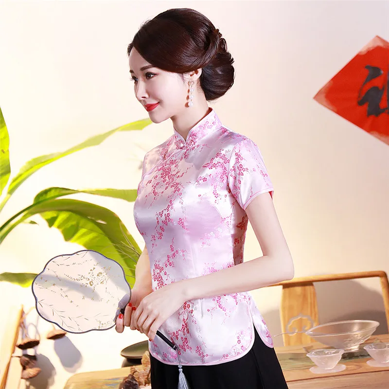 Китайский традиционный женский топ размера плюс 3xl 4xl, атласная блузка с цветами, винтажная рубашка ручной работы на пуговицах, костюм с коротким рукавом