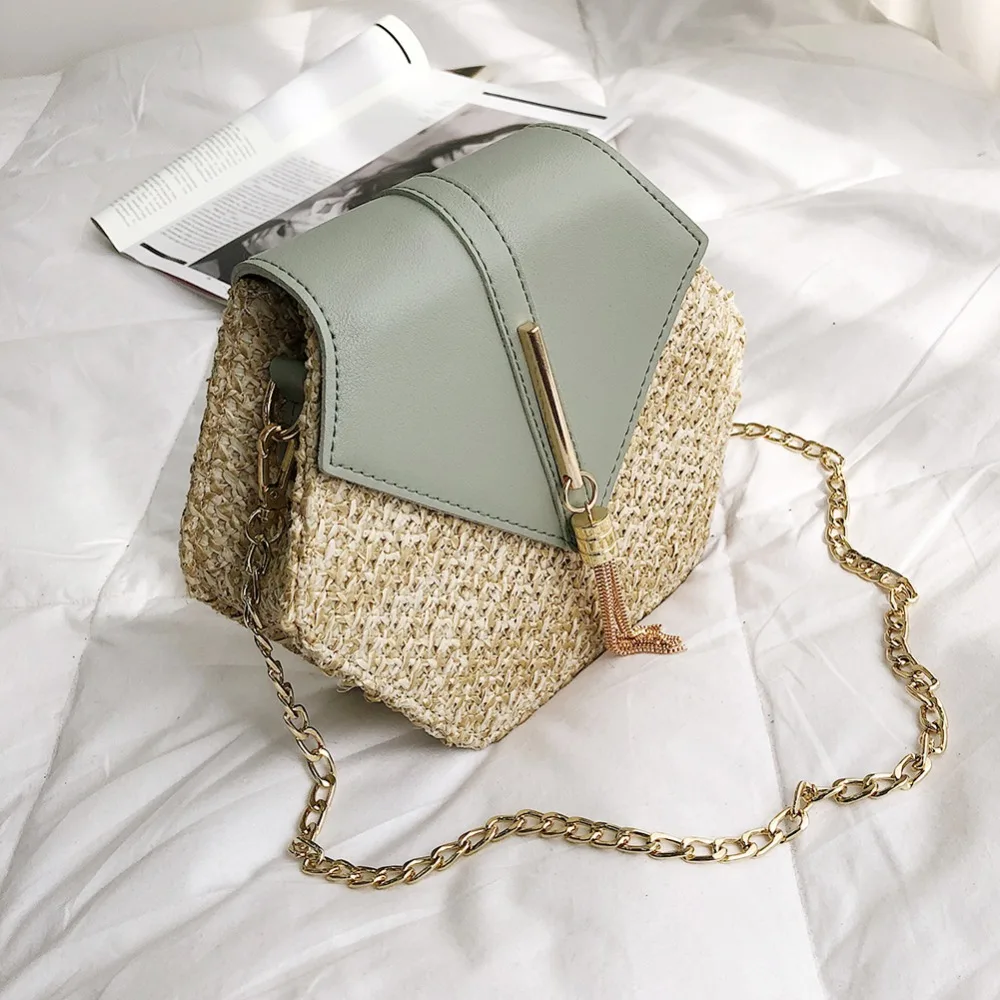 Сумка на ремне для женщин, стильная шестиугольная Плетеная соломенная и кожаная сумочка ручной работы, пляжный круглый богемный мешок на плечо