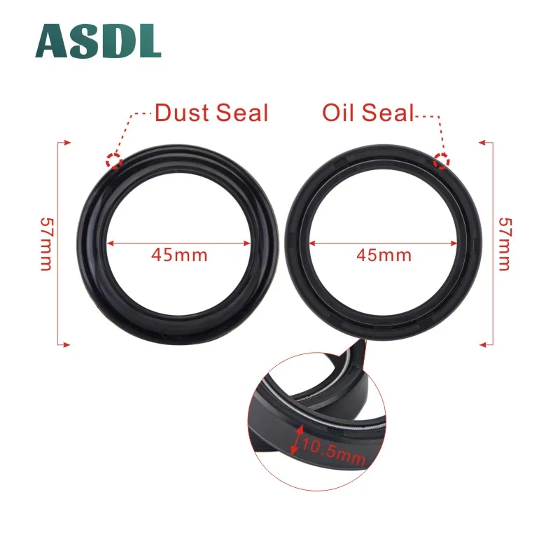 1. Сальник и пылезащитное уплотнение 1 комплект содержит 2 пары 2. Двойной пружины сальник 45*57*10,5 (1 пара) 3. Пылезащитное уплотнение 45*57 (1 пара)