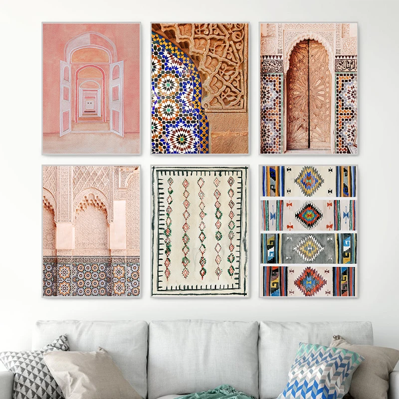 Марокканский ковер, розовые постеры и принты, эклектический домашни...