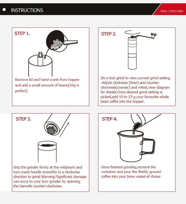Молет кофе отлично. На помол 20 грамм кофе уходит 4 минуты. Для кемпинга пойдет. На каждый день не очень. Нижний стакан-приемник слабо держится. Приходится придерживать рукой, что неудобно.