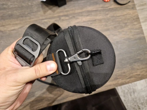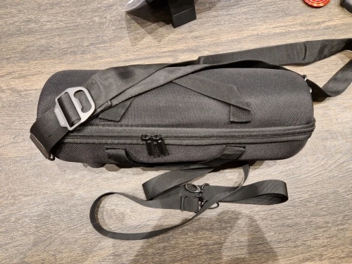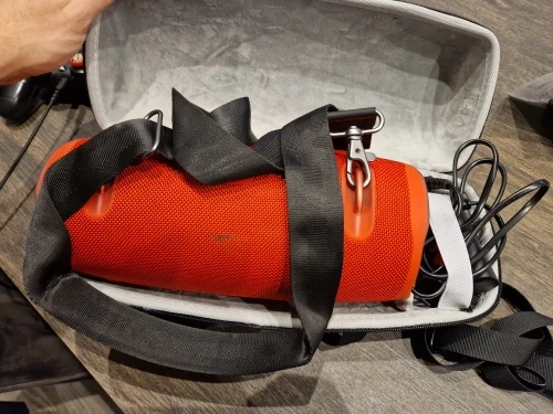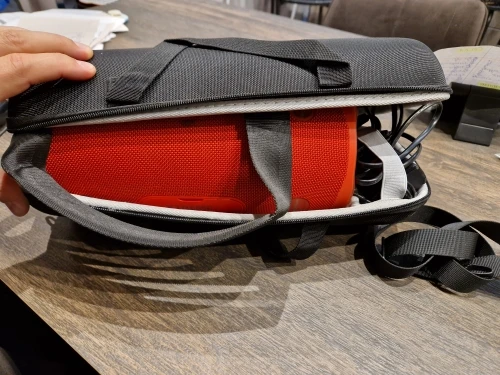 прикольный бокс. влезла и зарядка. но пришлось ремень отстегнуть от колонки ( с ним бокс не закрывался) и его пристегнуть к боксу. продавец лтрравил быстро, но посылка шла без нееди три месяца. очень долго.