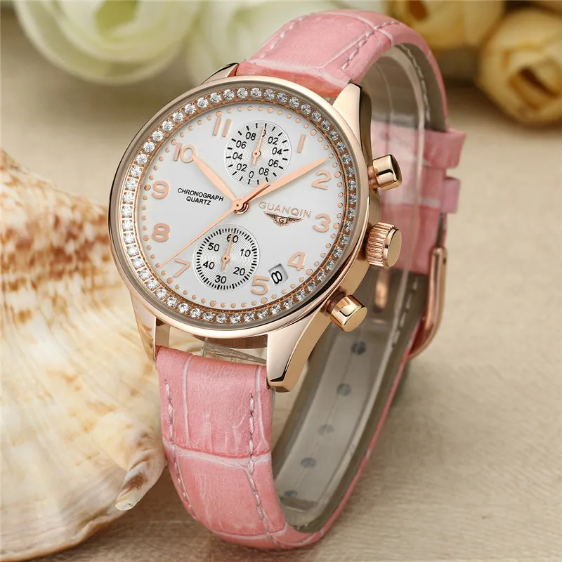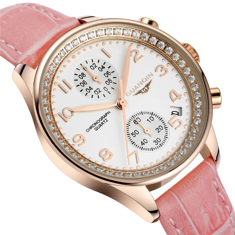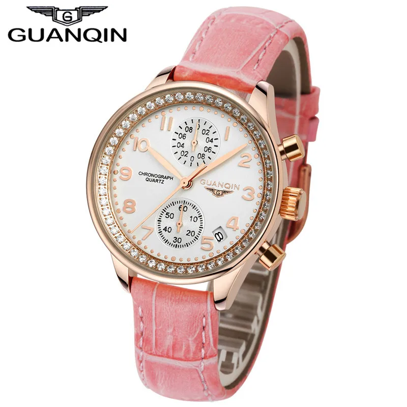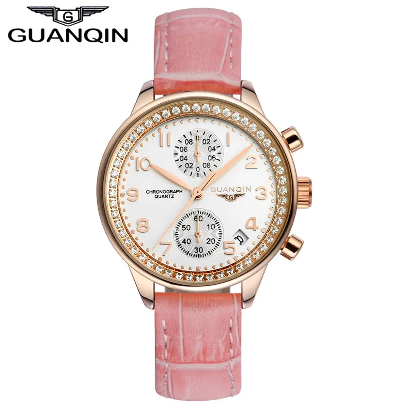 Часы GUANQIN женские, модные, Роскошные, брендовые, с хронографом, для девушек, новые, кожаные, кварцевые, с кристаллами, женские, под платье, наручные часы