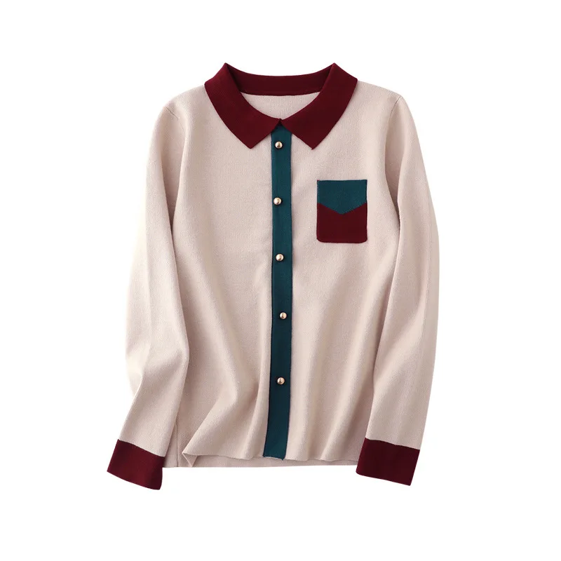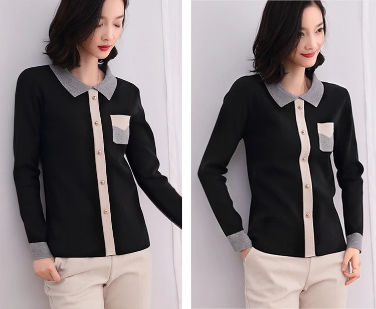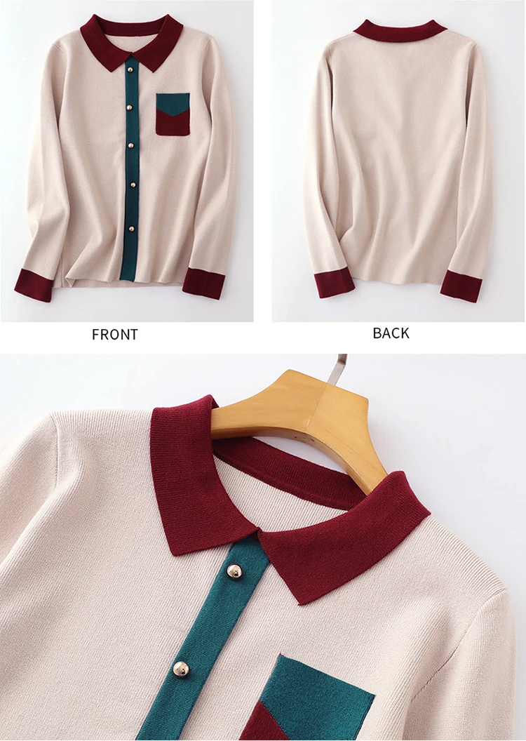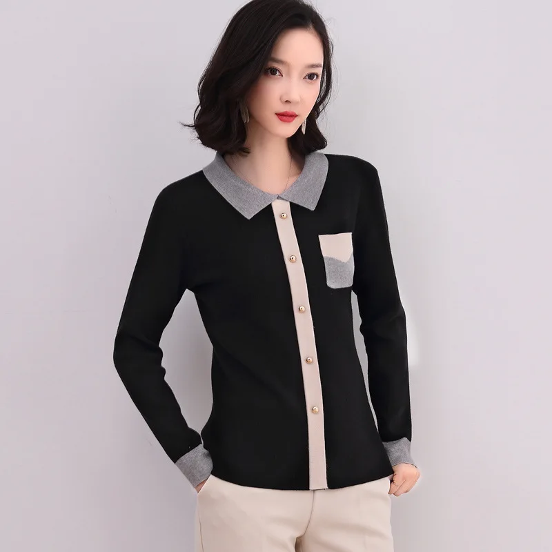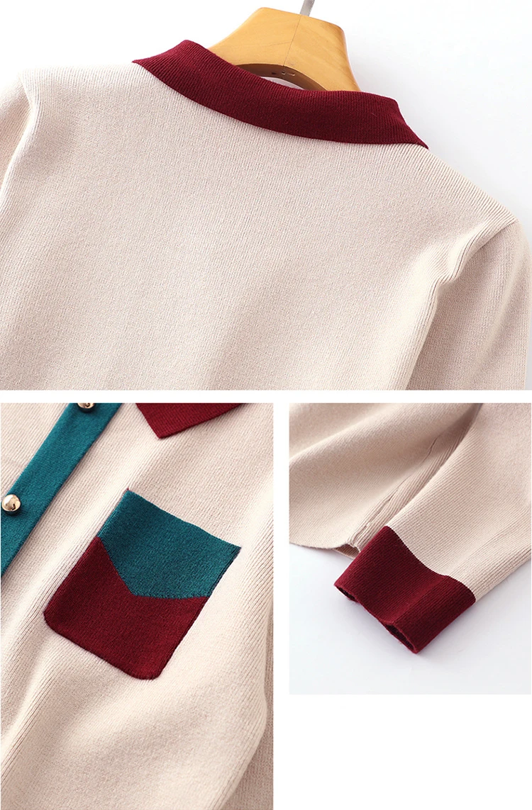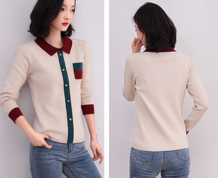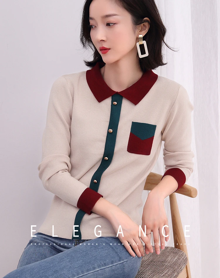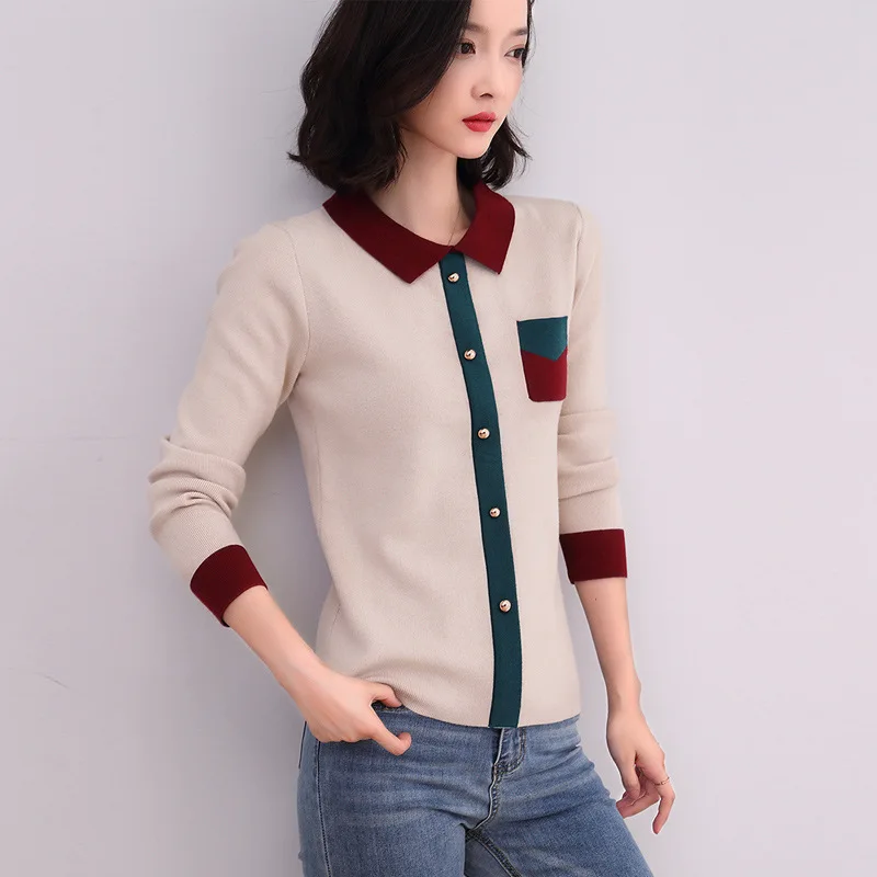 Женский вязаный свитер, Осенний Модный пуловер с отложным воротником, трикотажный свитер контрастных цветов, женские свитера, вязаные топы, 2019