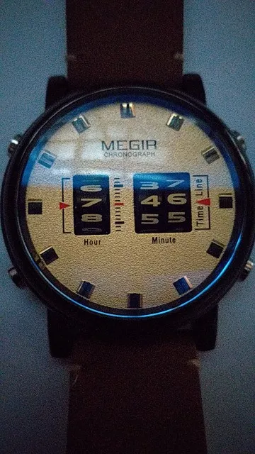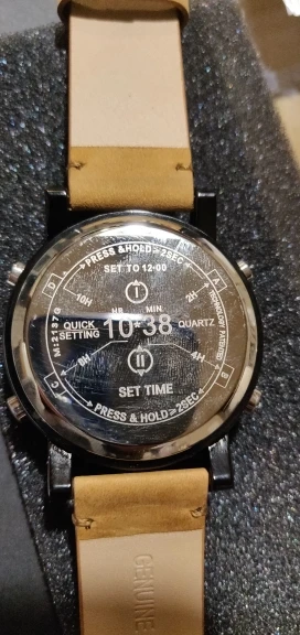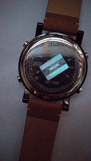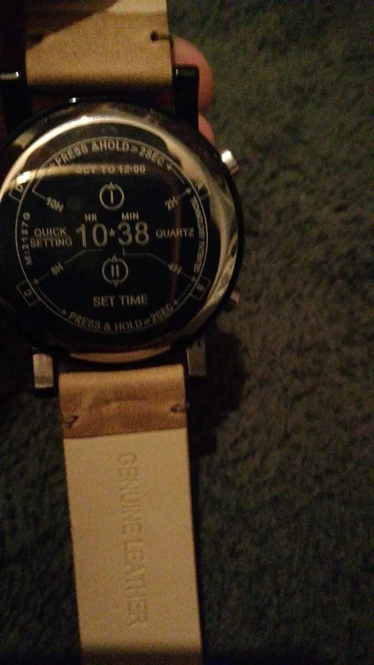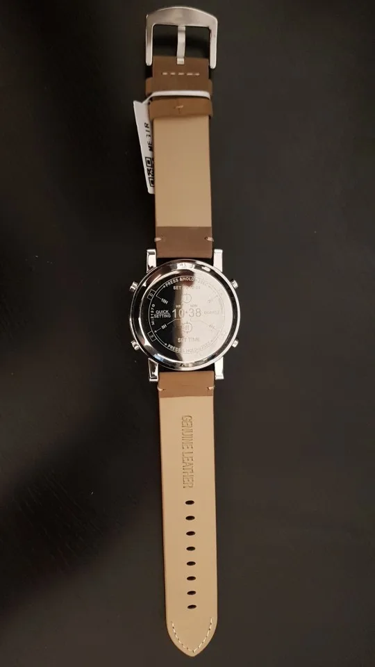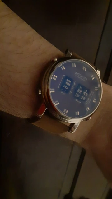 Внешне часы выглядят очень хорошо и качественно. Ремешок конечно же не кожа. Часы толстые 16-17 мм. Выглядят массивно. Циферблат у часов с синим ремешком не синий, а графитовый. Синиву придает оттенок стекла. Инструкция на задней крышке, НО до конца в ней я так и не разобрался. Сложновато. Барабаны немного смещены, но не критично. На кнопках изначально защитная пленка - это на тот случай если кто то подумает что они потерты или непонятного цвета. Все надписи на циферблате и цифры на барабанах нанесены/написаны/нарисованы аккуратно. За свои деньги интересная "игрушка". А, ну и ремешок моментально засаливается/затирается.