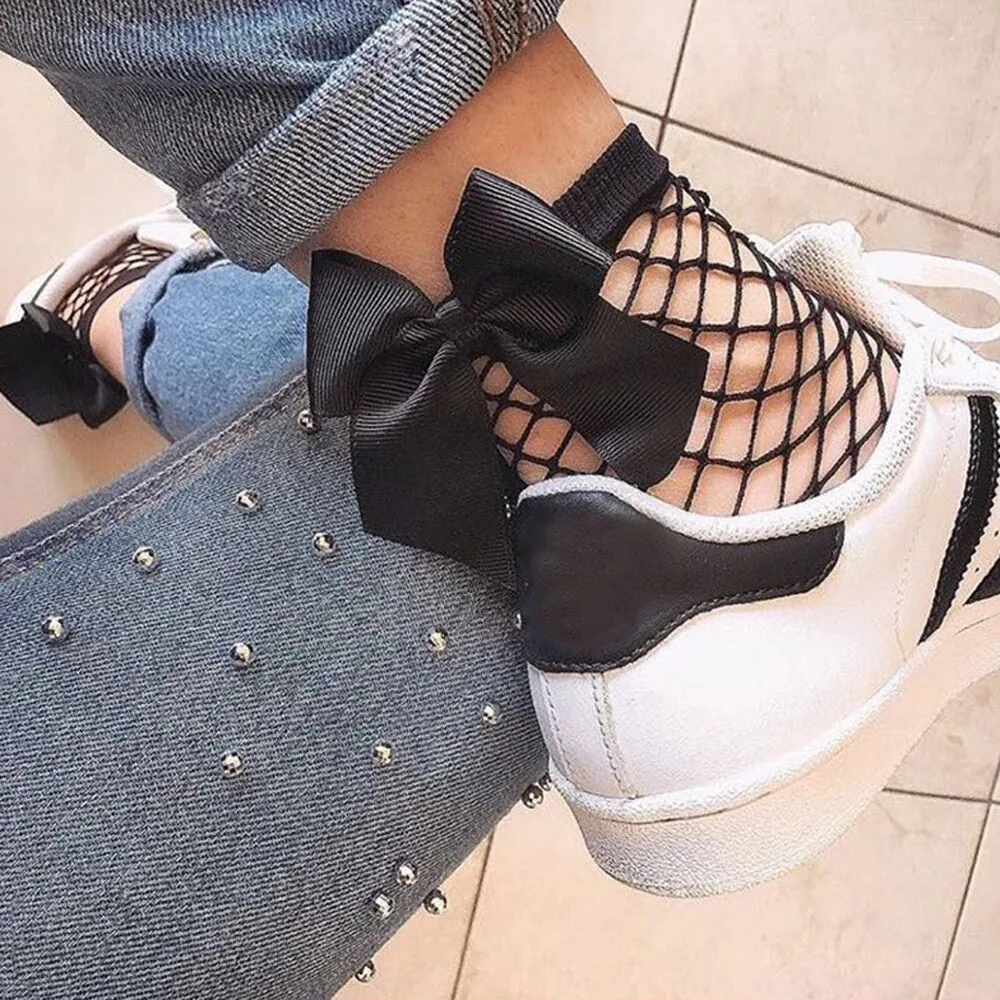 Женские уличные носки в сеточку с бантом, дышащие черные носки в ст...
