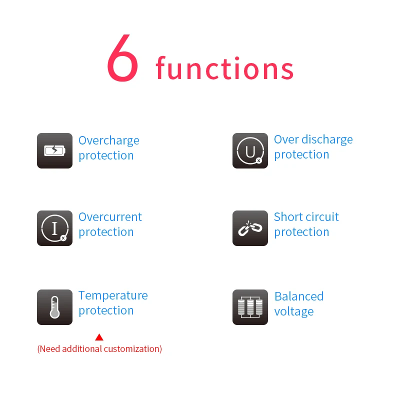 Основные функции: защита от перезарядки, защита от разрядки, защита от перегрузки по току, защита от короткого замыкания, защита от температуры и т. д.